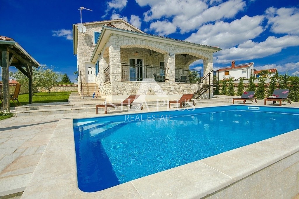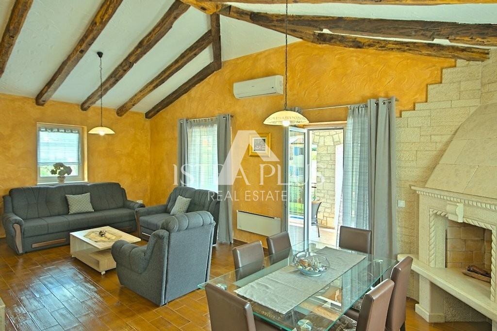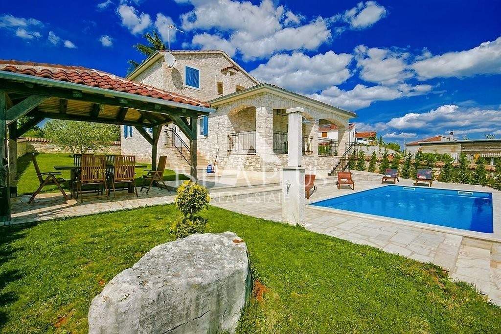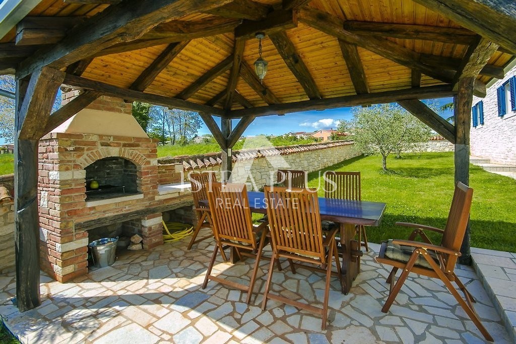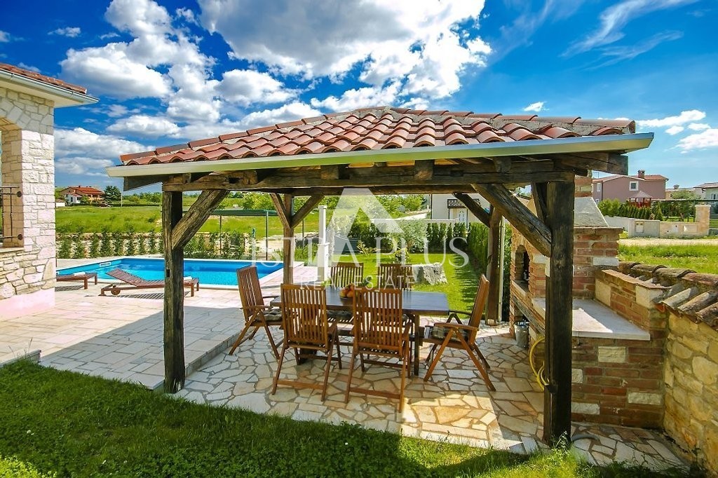 Einfamilienhaus mit Pool in einer kleinen istrischen Stadt in sehr ruhiger Lage. Es wurde 2013 im autochthonen, istrischen Stil auf einem Grundstück von 770 m2 erbaut. Es besteht aus Erdgeschoss und Obergeschoss. Das Erdgeschoss verfügt über eine Eingangshalle, Flur, Speisekammer, Schlafzimmer, Bad, Küche, Wohnzimmer, Abstellraum und eine große überdachte Terrasse von 20 m2. Eine Innentreppe führt in den ersten Stock, wo sich zwei weitere Schlafzimmer, ein Badezimmer und eine überdachte Terrasse von 9 m2 befinden. Jedes Zimmer verfügt über einen Fernseher und Internet. Das Haus hat 162,53 m2 Nutzfläche mit Terrassen (nach dem Koeffizienten etwas weniger - 145 m2). Das Haus ist komplett mit Möbeln und Geräten ausgestattet und wird zu touristischen Zwecken vermietet. Im Garten gibt es einen Swimmingpool von 33 m2 und eine Sommerküche, einen überdachten Parkplatz für zwei Autos und einen gepflegten Garten. Aufgrund der vielen Reservierungen hat das Haus ein großes Potenzial für die touristische Vermietung, kann aber auch als Wohnzweck dienen.