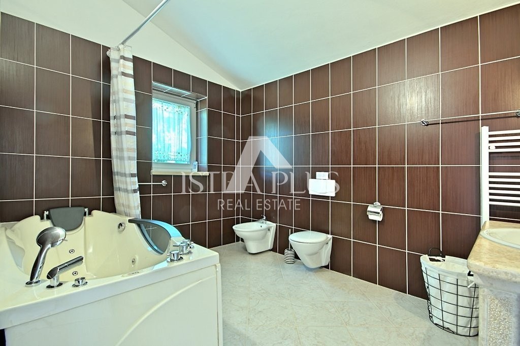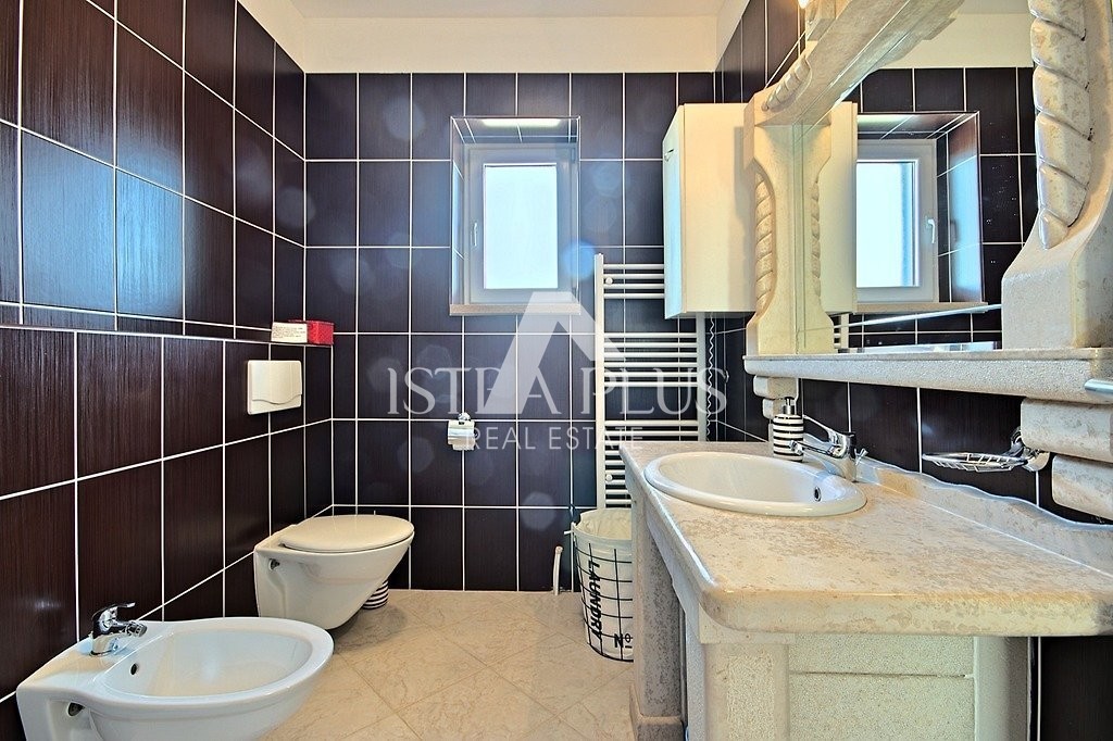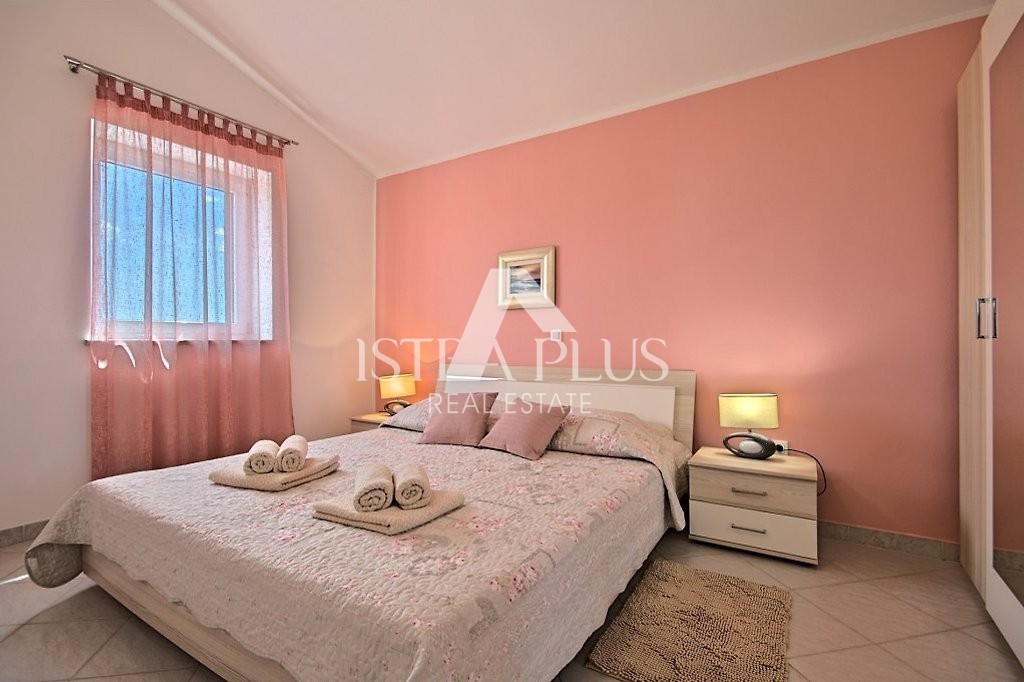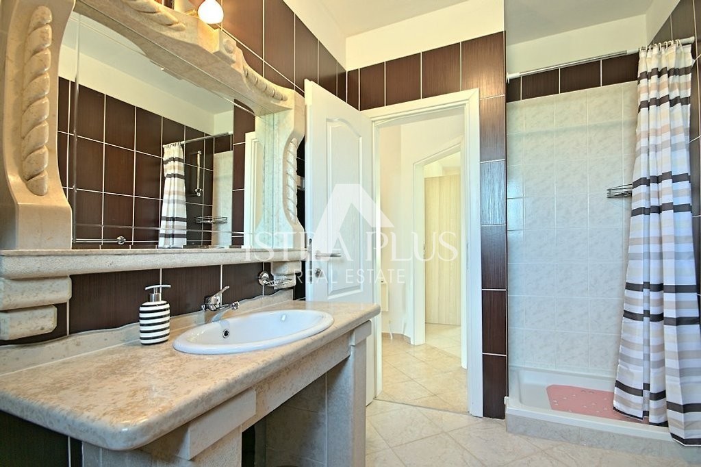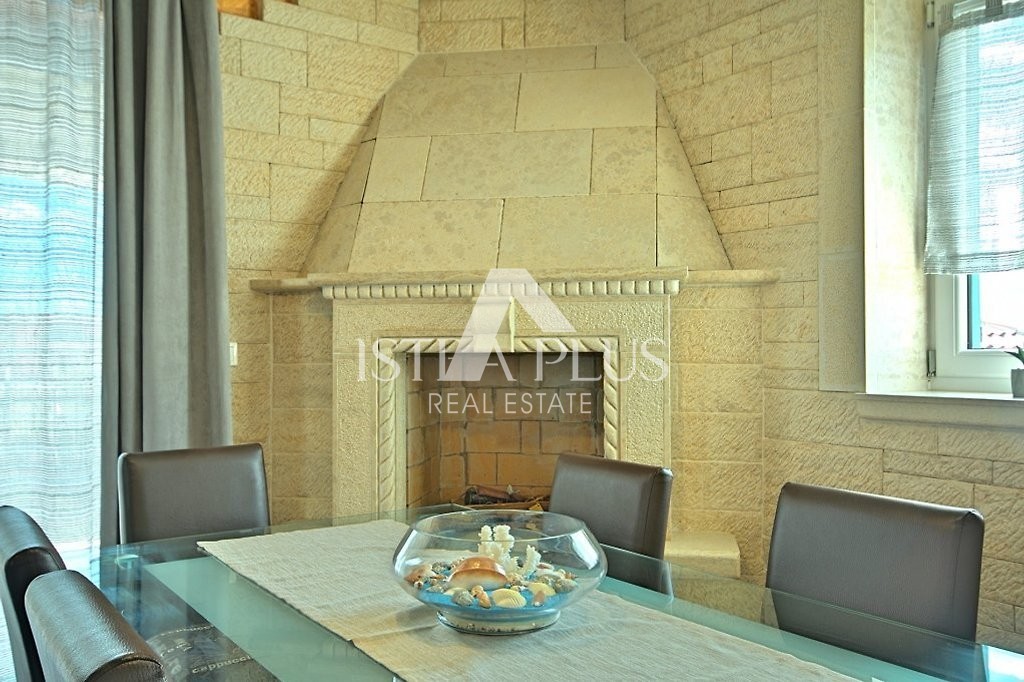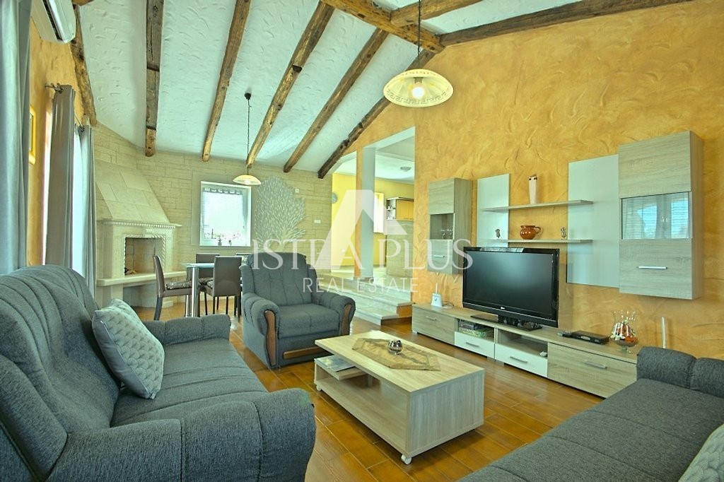 Einfamilienhaus mit Pool in einer kleinen istrischen Stadt in sehr ruhiger Lage. Es wurde 2013 im autochthonen, istrischen Stil auf einem Grundstück von 770 m2 erbaut. Es besteht aus Erdgeschoss und Obergeschoss. Das Erdgeschoss verfügt über eine Eingangshalle, Flur, Speisekammer, Schlafzimmer, Bad, Küche, Wohnzimmer, Abstellraum und eine große überdachte Terrasse von 20 m2. Eine Innentreppe führt in den ersten Stock, wo sich zwei weitere Schlafzimmer, ein Badezimmer und eine überdachte Terrasse von 9 m2 befinden. Jedes Zimmer verfügt über einen Fernseher und Internet. Das Haus hat 162,53 m2 Nutzfläche mit Terrassen (nach dem Koeffizienten etwas weniger - 145 m2). Das Haus ist komplett mit Möbeln und Geräten ausgestattet und wird zu touristischen Zwecken vermietet. Im Garten gibt es einen Swimmingpool von 33 m2 und eine Sommerküche, einen überdachten Parkplatz für zwei Autos und einen gepflegten Garten. Aufgrund der vielen Reservierungen hat das Haus ein großes Potenzial für die touristische Vermietung, kann aber auch als Wohnzweck dienen.