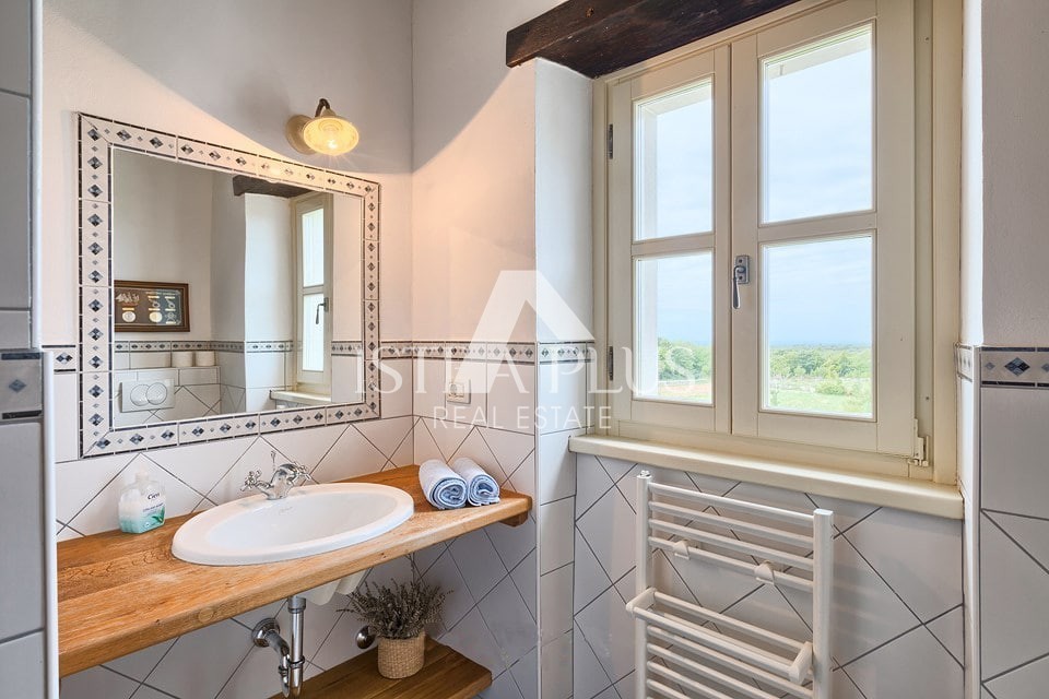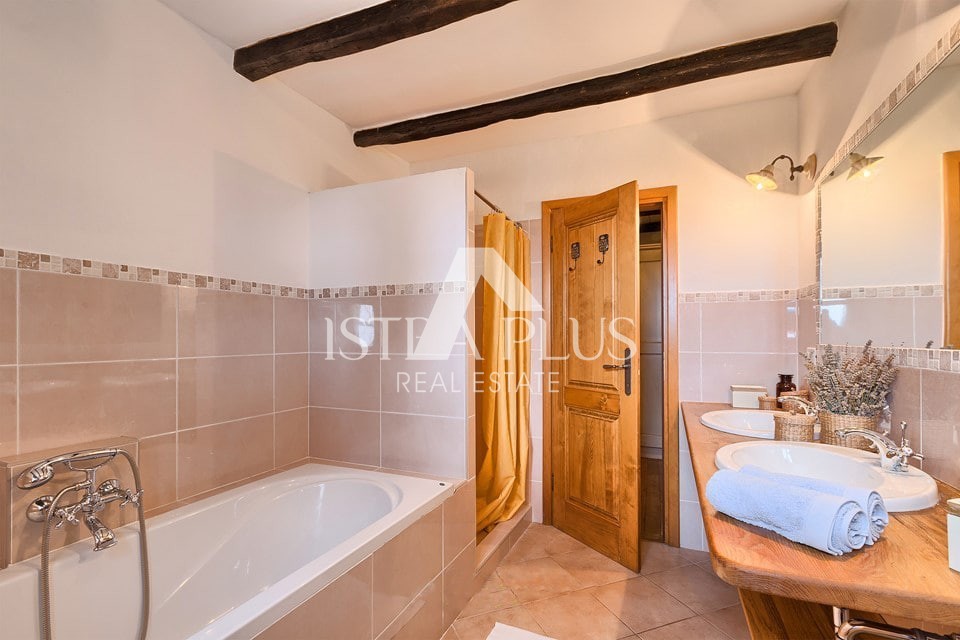 Upstairs there are 3 double rooms with attached bathrooms and wardrobes. The upper floor leads to a covered terrace located on the west side, where you can enjoy the view of the sea and the sunset in the evening, as well as the privacy and silence provided by nature. The villa is considered one of the most beautiful in Istria and has been published in many interior design magazines.