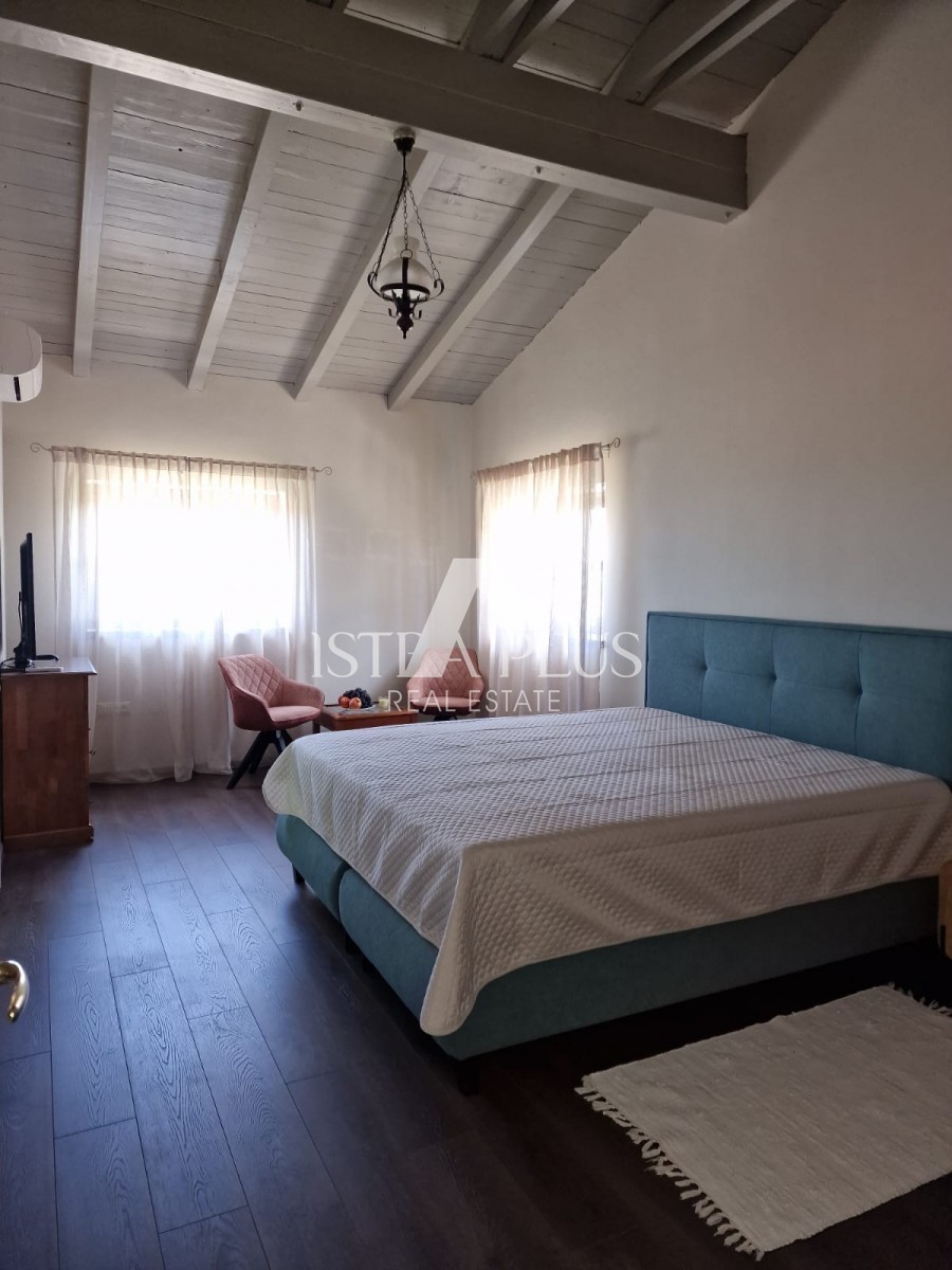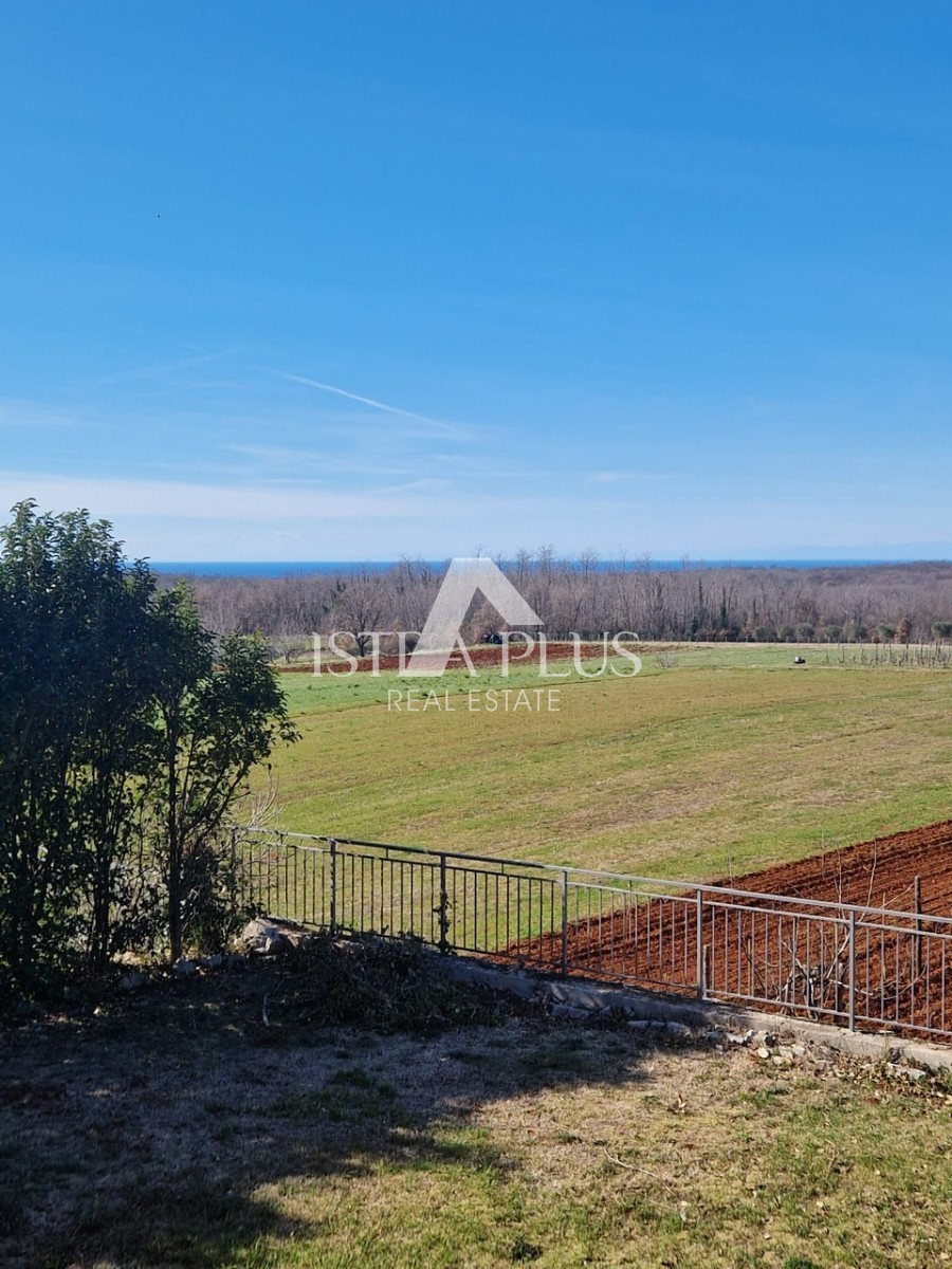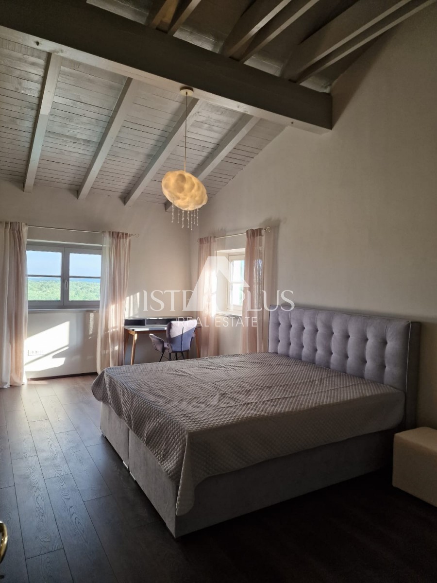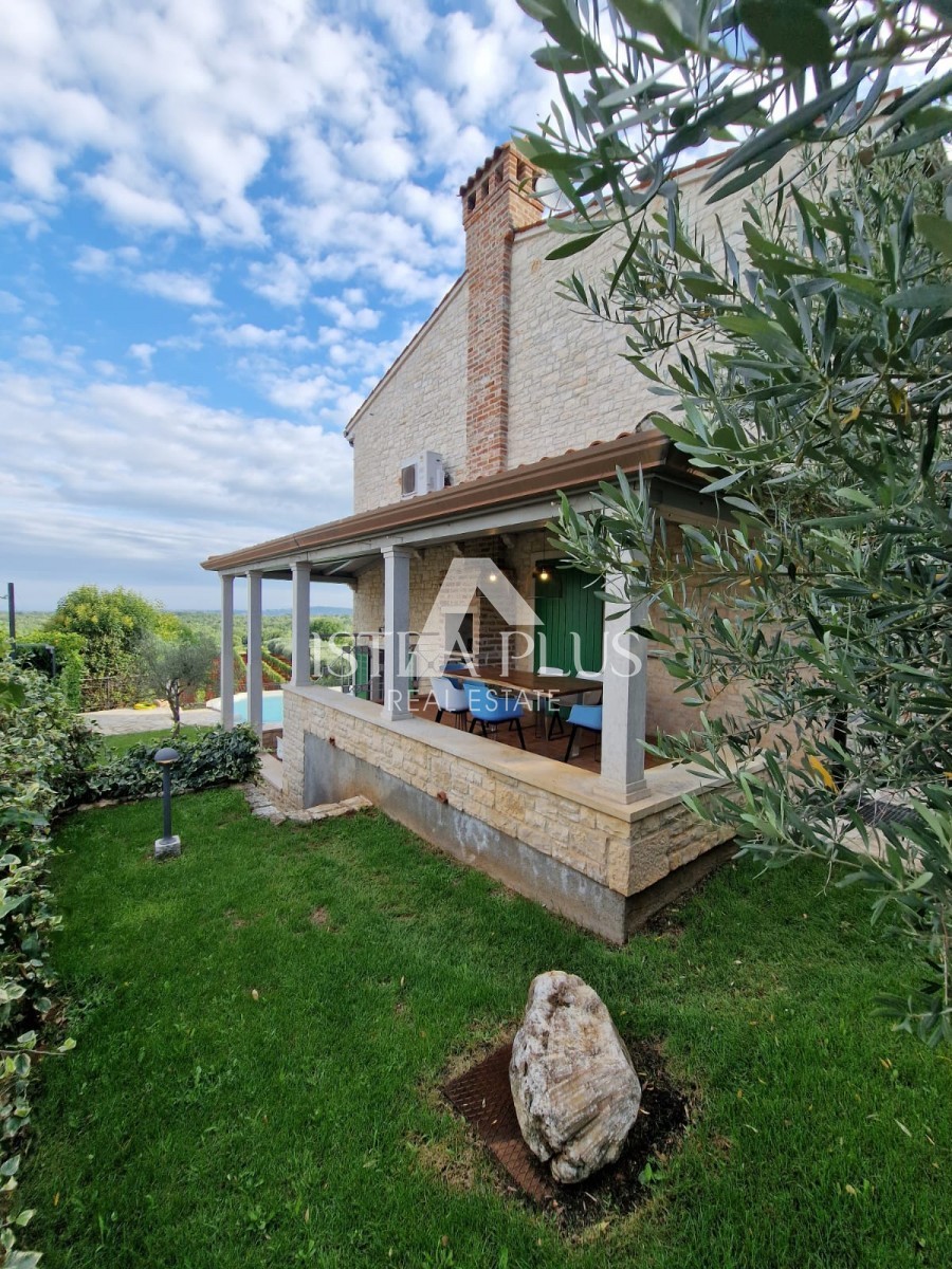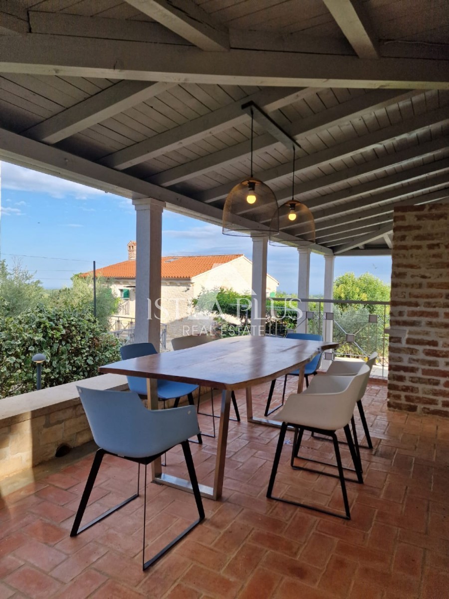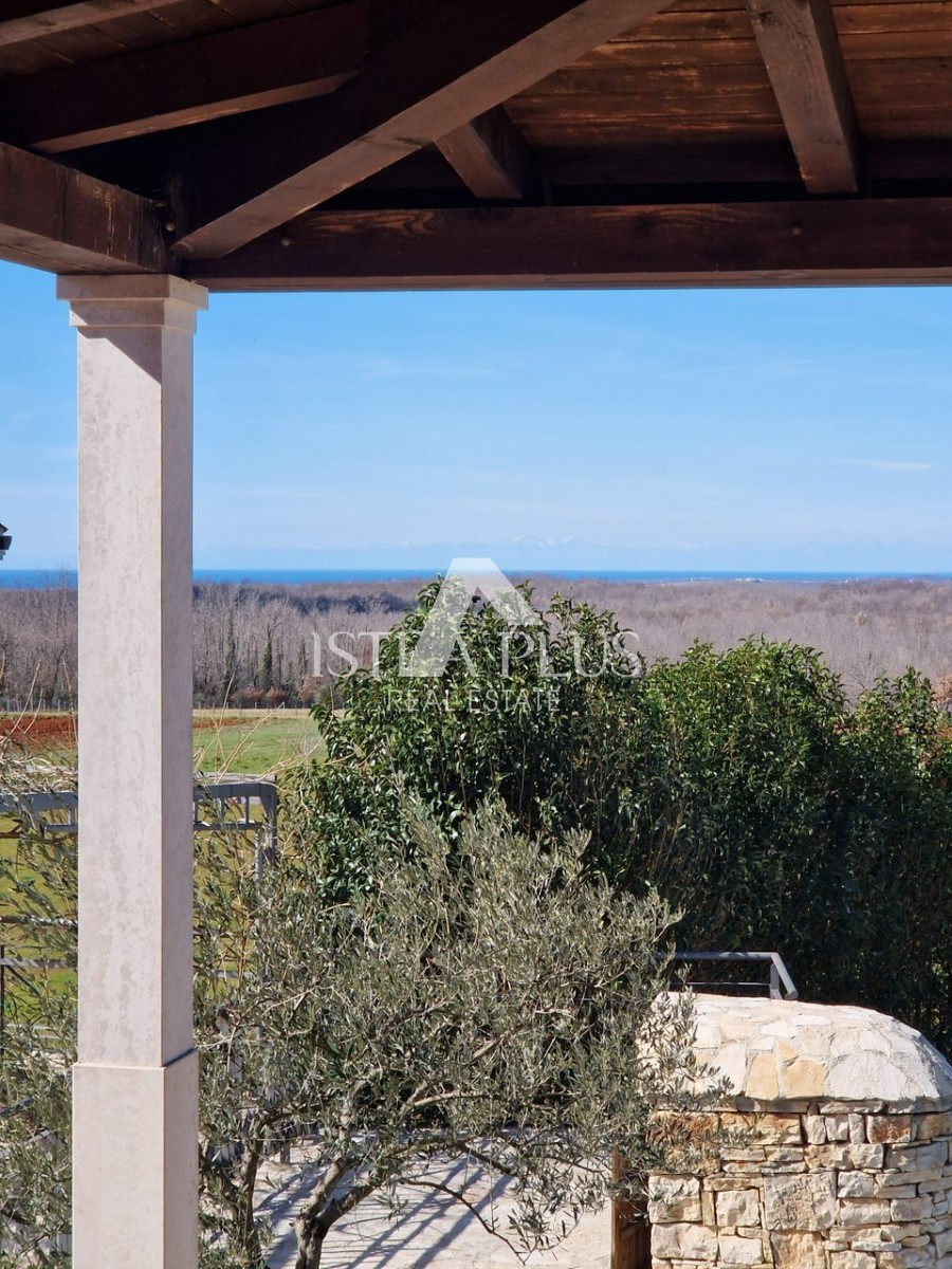 In einem ruhigen Dorf unweit von Poreč befindet sich diese charmante Villa im rustikalen Stil. Sie liegt erhöht und bietet einen freien Blick auf das Meer und die unberührte Natur. Dank des unbebauten Grundstücks vor dem Haus ist Privatsphäre garantiert.