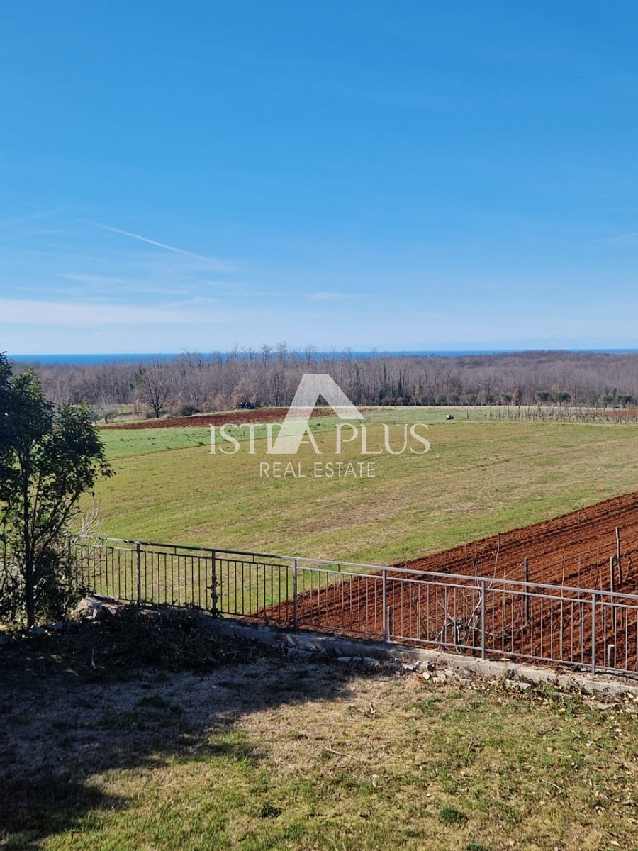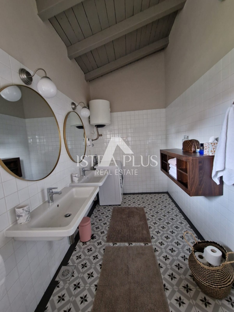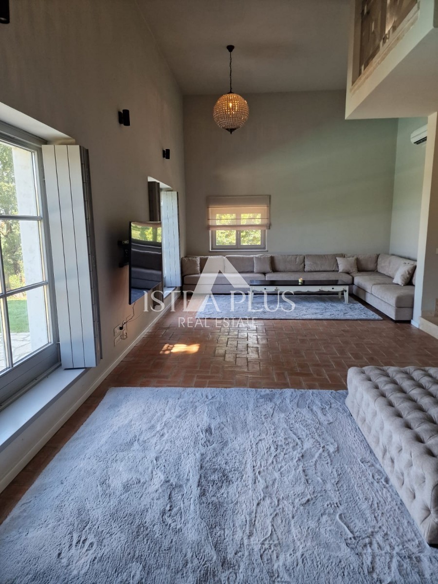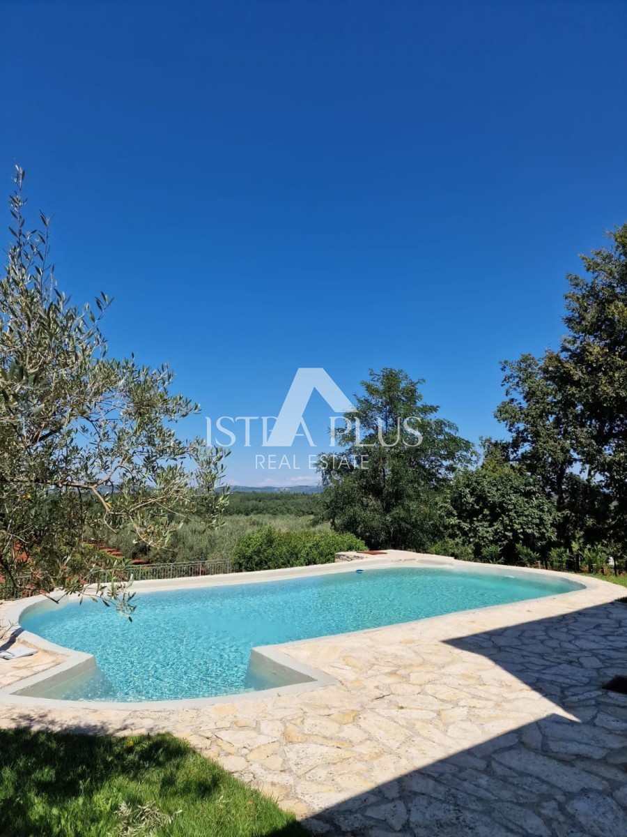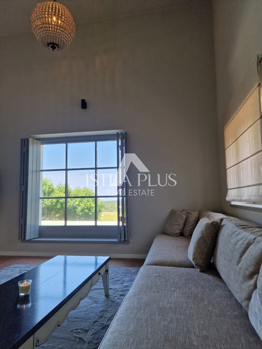 In einem ruhigen Dorf unweit von Poreč befindet sich diese charmante Villa im rustikalen Stil. Sie liegt erhöht und bietet einen freien Blick auf das Meer und die unberührte Natur. Dank des unbebauten Grundstücks vor dem Haus ist Privatsphäre garantiert.