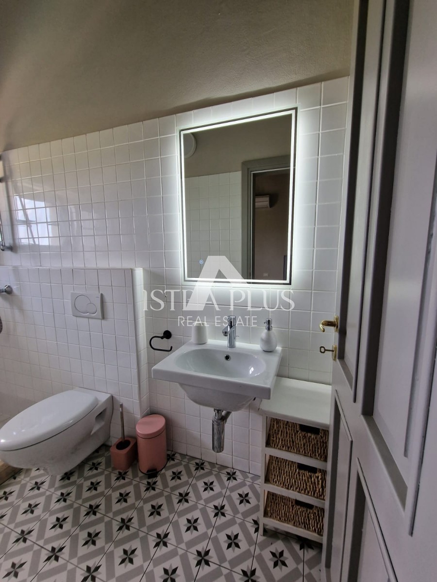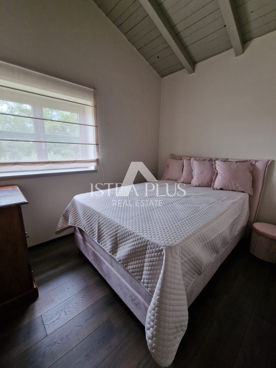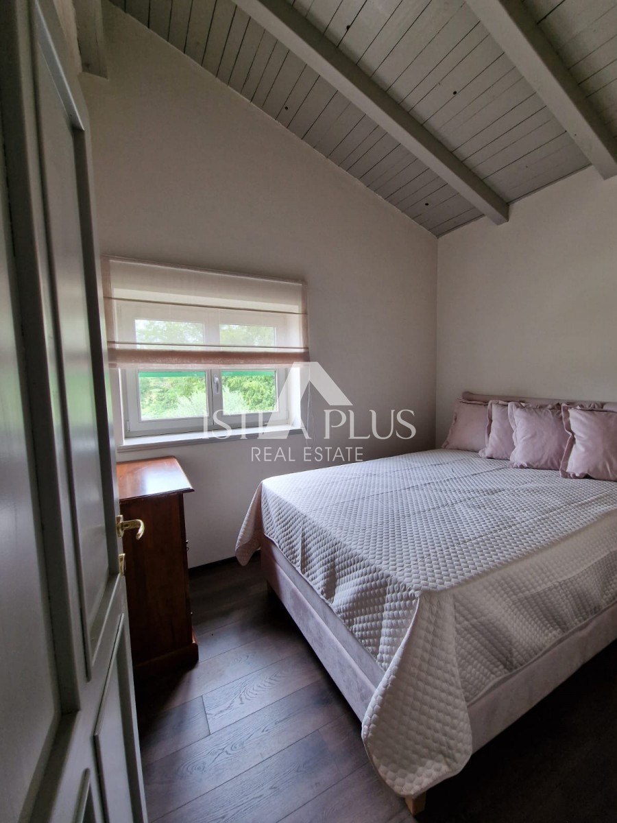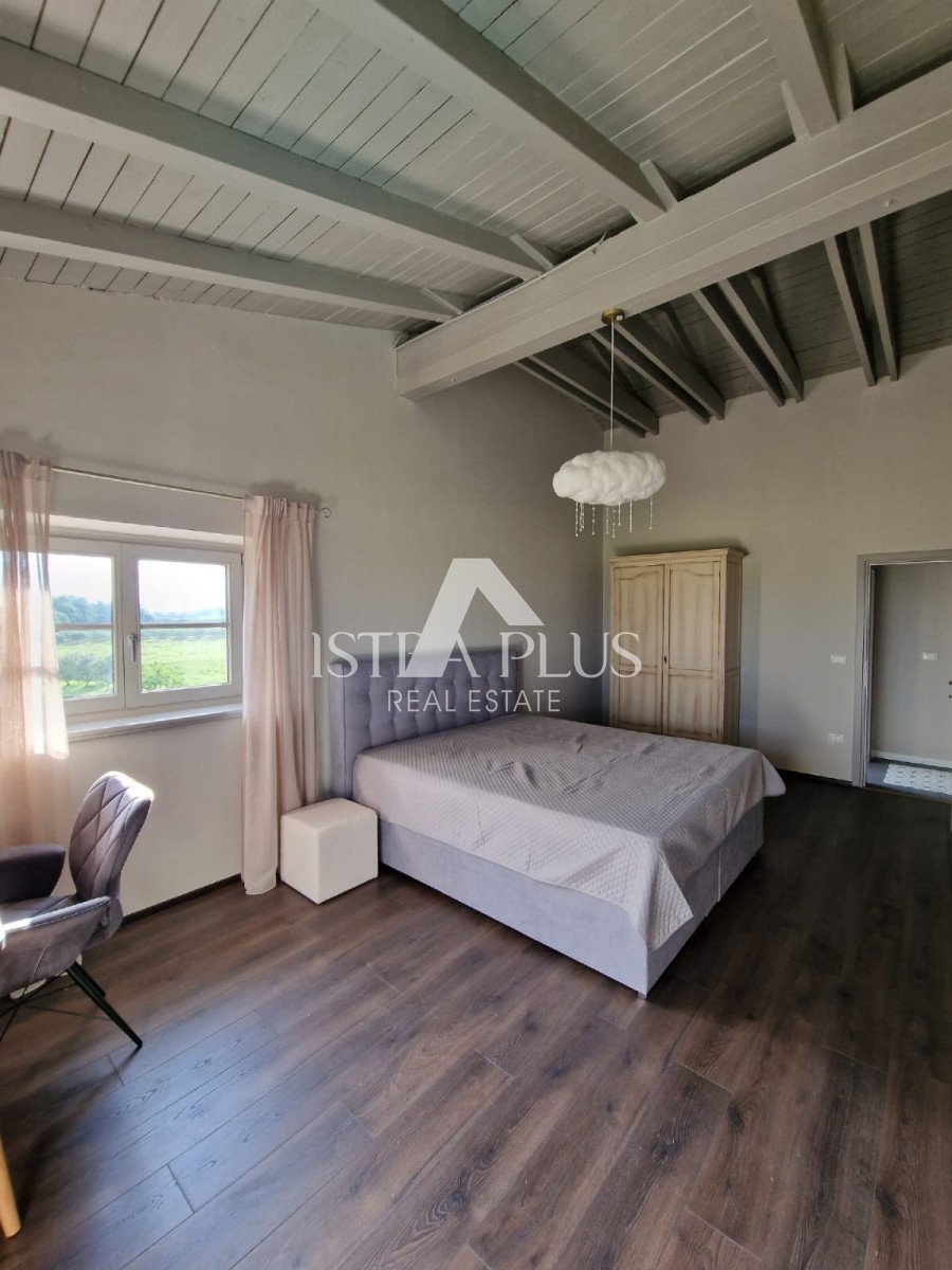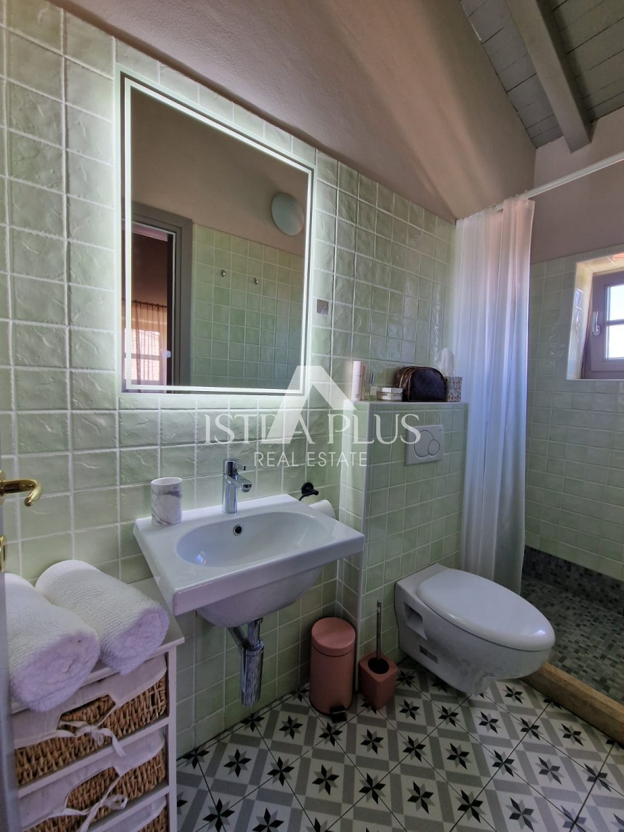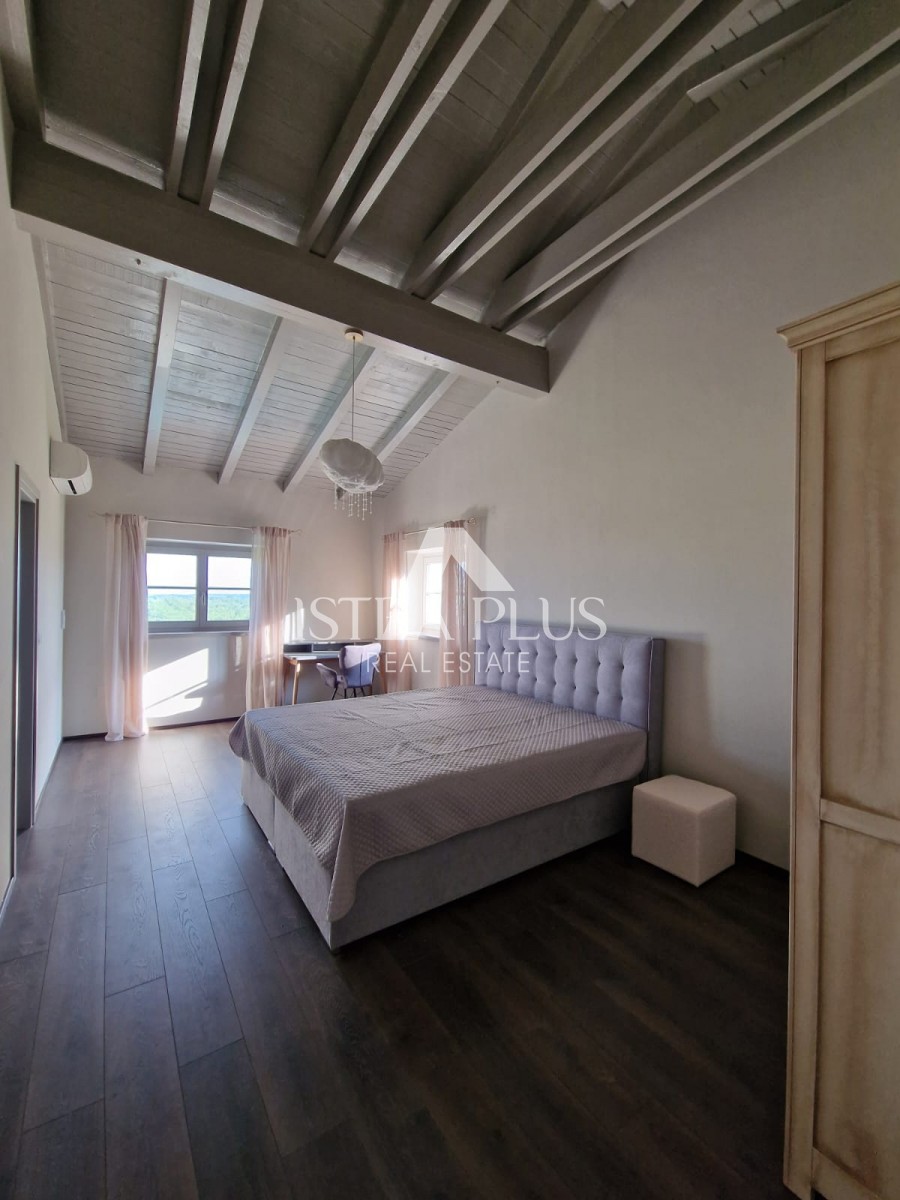 In einem ruhigen Dorf unweit von Poreč befindet sich diese charmante Villa im rustikalen Stil. Sie liegt erhöht und bietet einen freien Blick auf das Meer und die unberührte Natur. Dank des unbebauten Grundstücks vor dem Haus ist Privatsphäre garantiert.