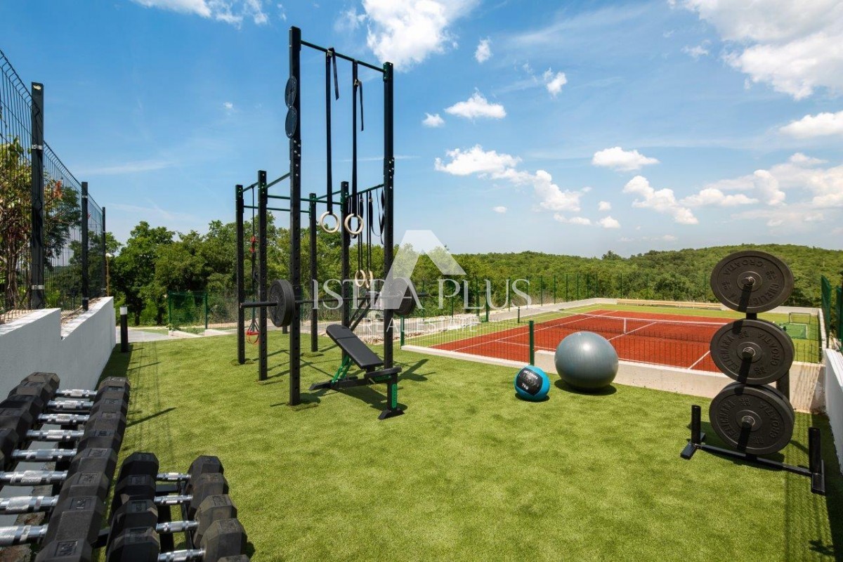 The garden is fully fenced and landscaped. The outdoor area boasts a private tennis court - multifunctional playground, outdoor gym, jacuzzi, heated pool (43.80 m2) with sun deck, summer outdoor kitchen, landscaped yard in a Mediterranean setting.