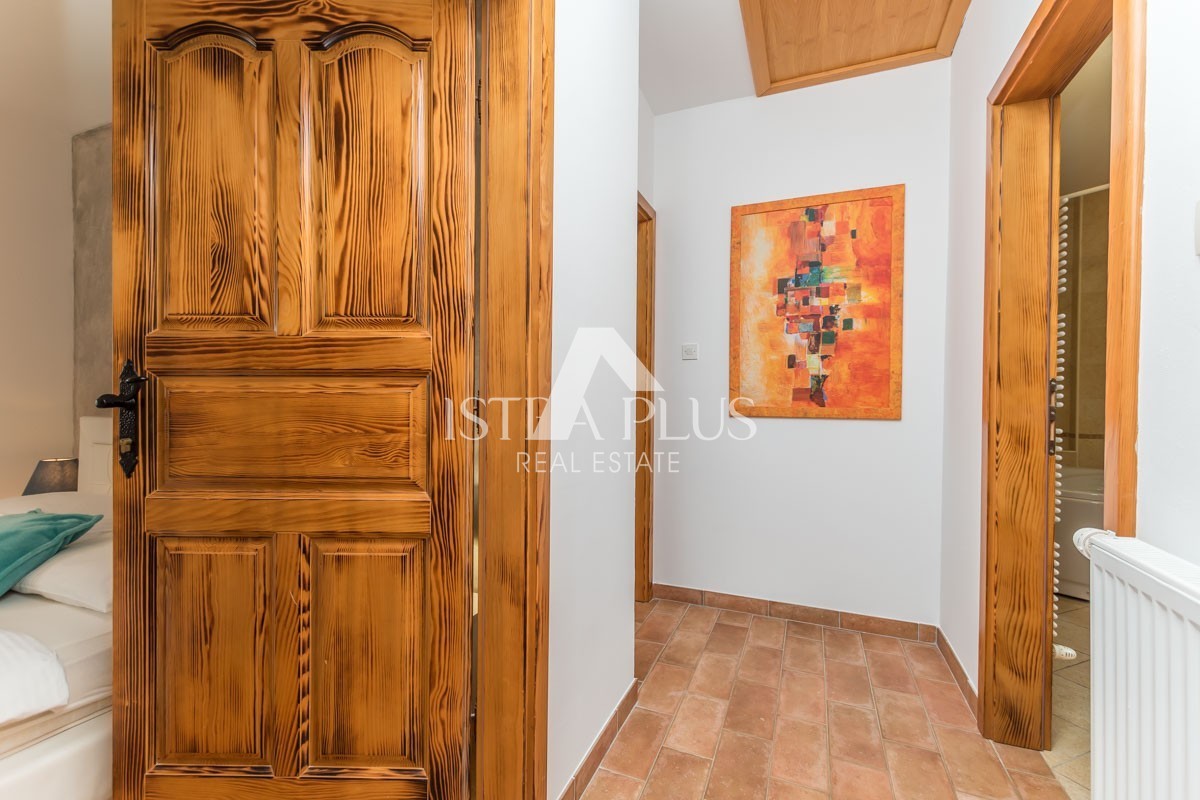 At the very entrance to the ground floor, it is evident that the owner has decorated the villa with great attention to detail, a spacious hallway with a guest toilet leads to a modernly equipped living room with an open fireplace and a fully equipped kitchen and dining room with access to the outdoor terrace and swimming pool. Discreetly separated on the ground floor is a modernly equipped bedroom with a bathroom.