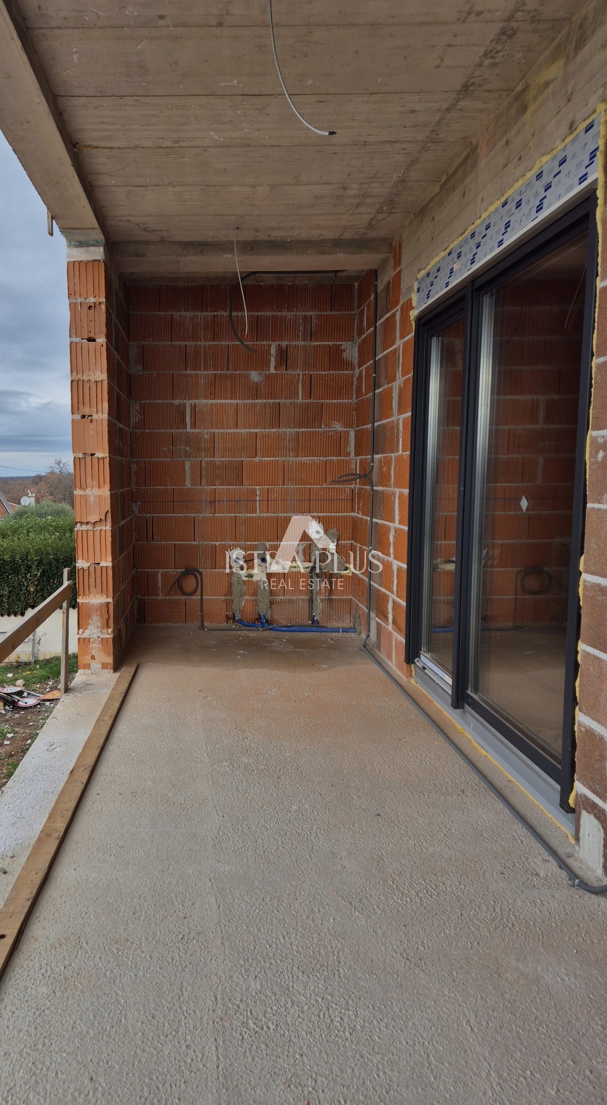 Moderan stan u novogradnji na 1. katu zgrade s liftom, smješten u mirnom okruženju u blizini Poreča, s panoramskim pogledom na more i istarski krajolik.