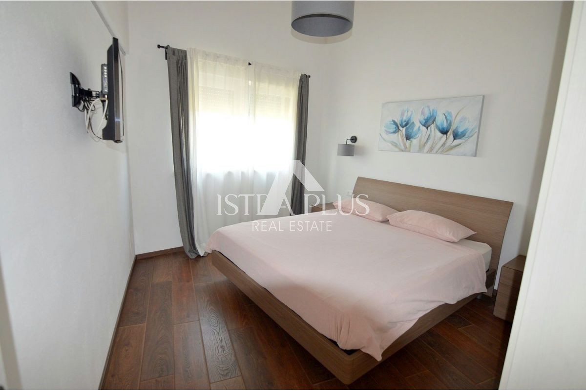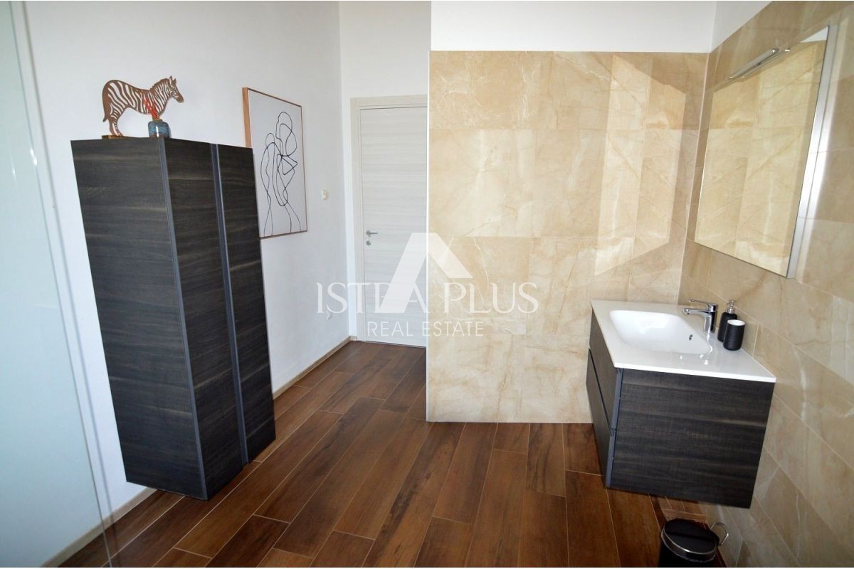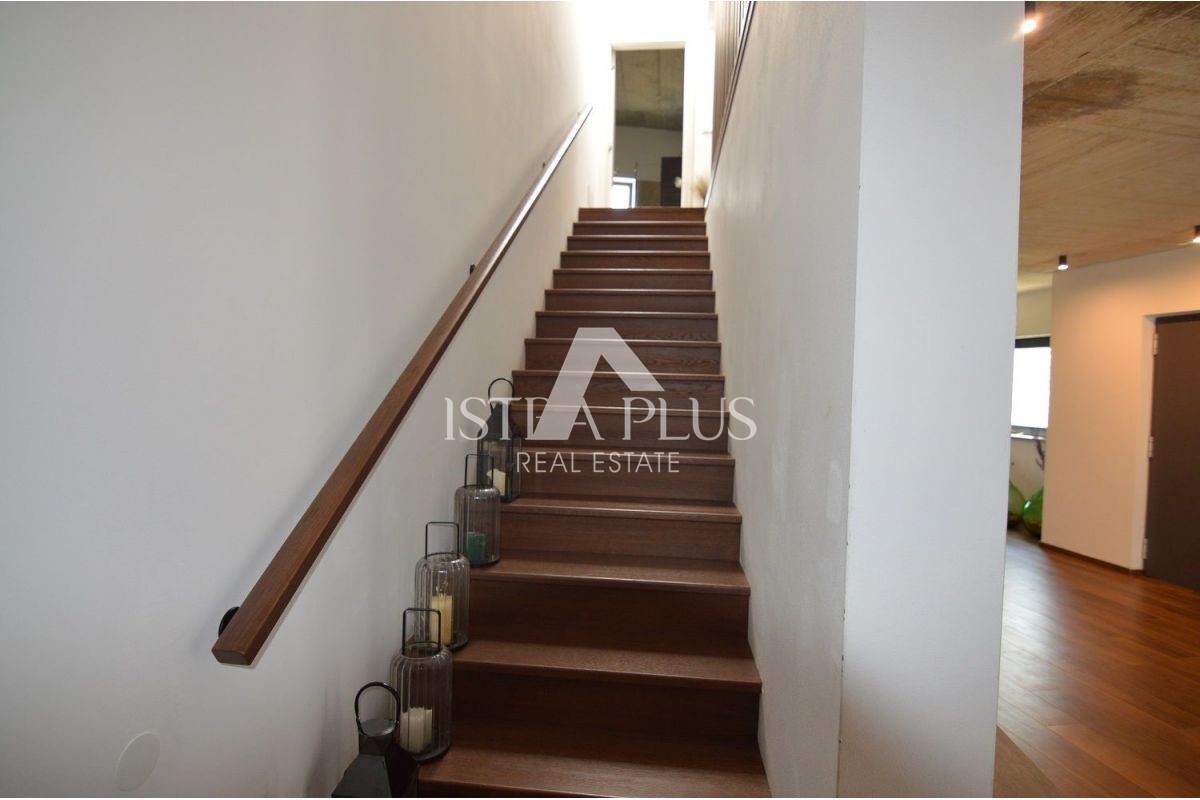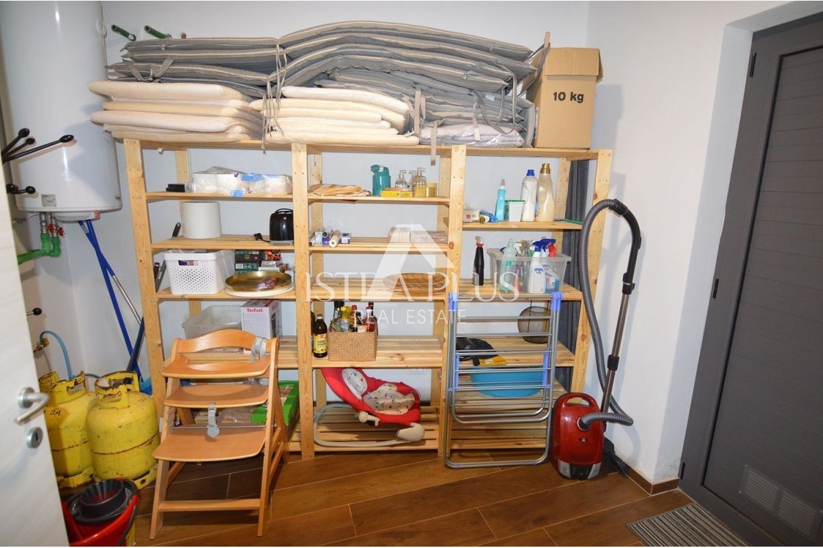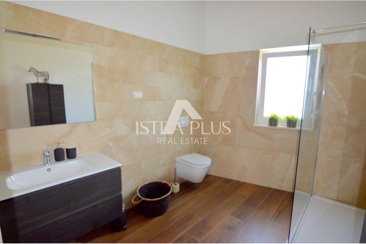 Iz dnevnog boravka se izlazi na natkrivenu terasu gdje je previđena ljetna kuhinja sa pogledom na bazen. Gornji kat se sastoji od tri spavaće sobe, glavna spavaća soba raspolaže vlatitiom kupaonicom i velikom terasom, dok druge dvije djele kupaonicu.