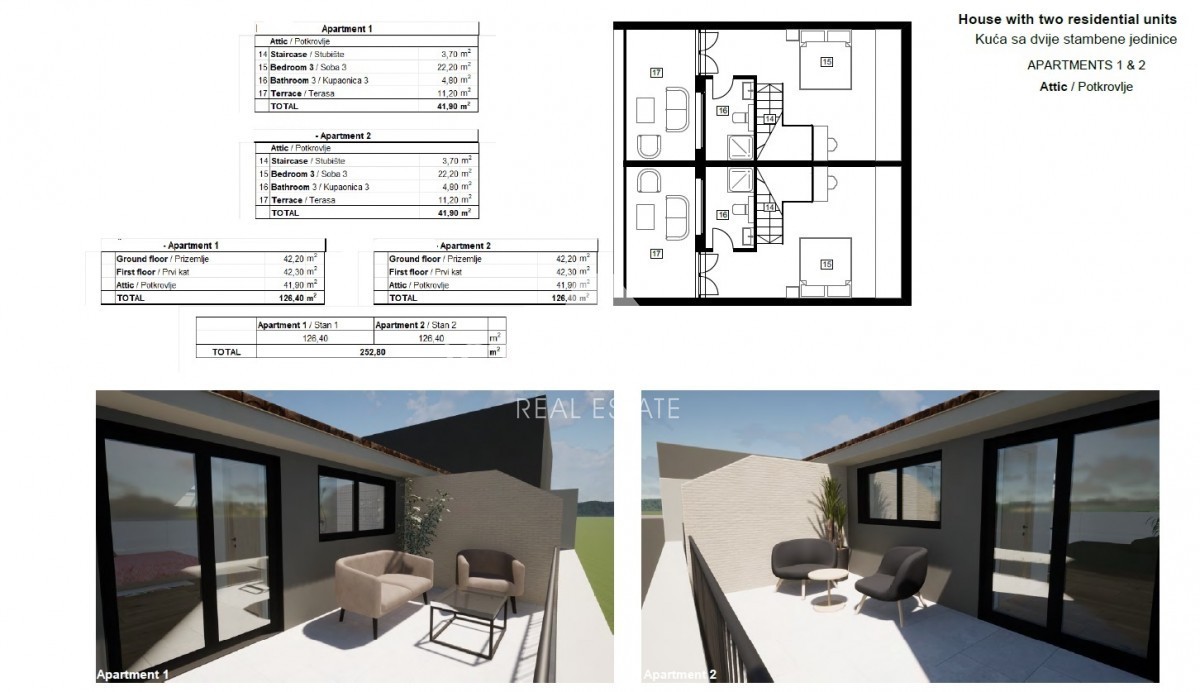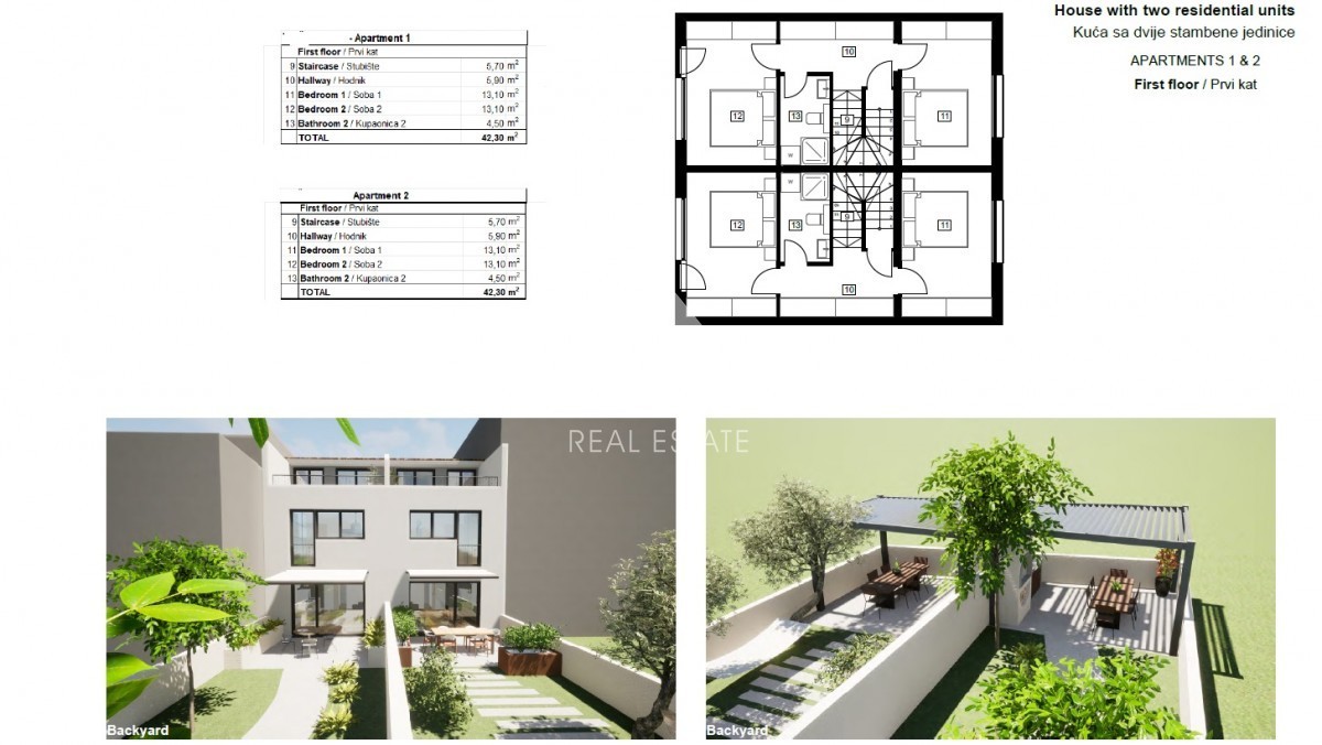 Ispred kuća biti ulazno-popločeno dvorište sa parkirnim mjestima. U prizemlju ulazni hodnik,spremište,kupaona, kuhinja sa blagovaonom i dnevnim boravkom -izlaz na uređeno dvorište od cca. 150m2 sa ljetnom kuhinjom. Na prvome katu smjestile su se dvije spavaće sobe i zajednička kupaona u hodniku. Potkrovlje će biti uređeno kao spavaća soba sa vlastitom kupaonom i izlazom na krovnu terasu sa prekrasnim pogledom na more!