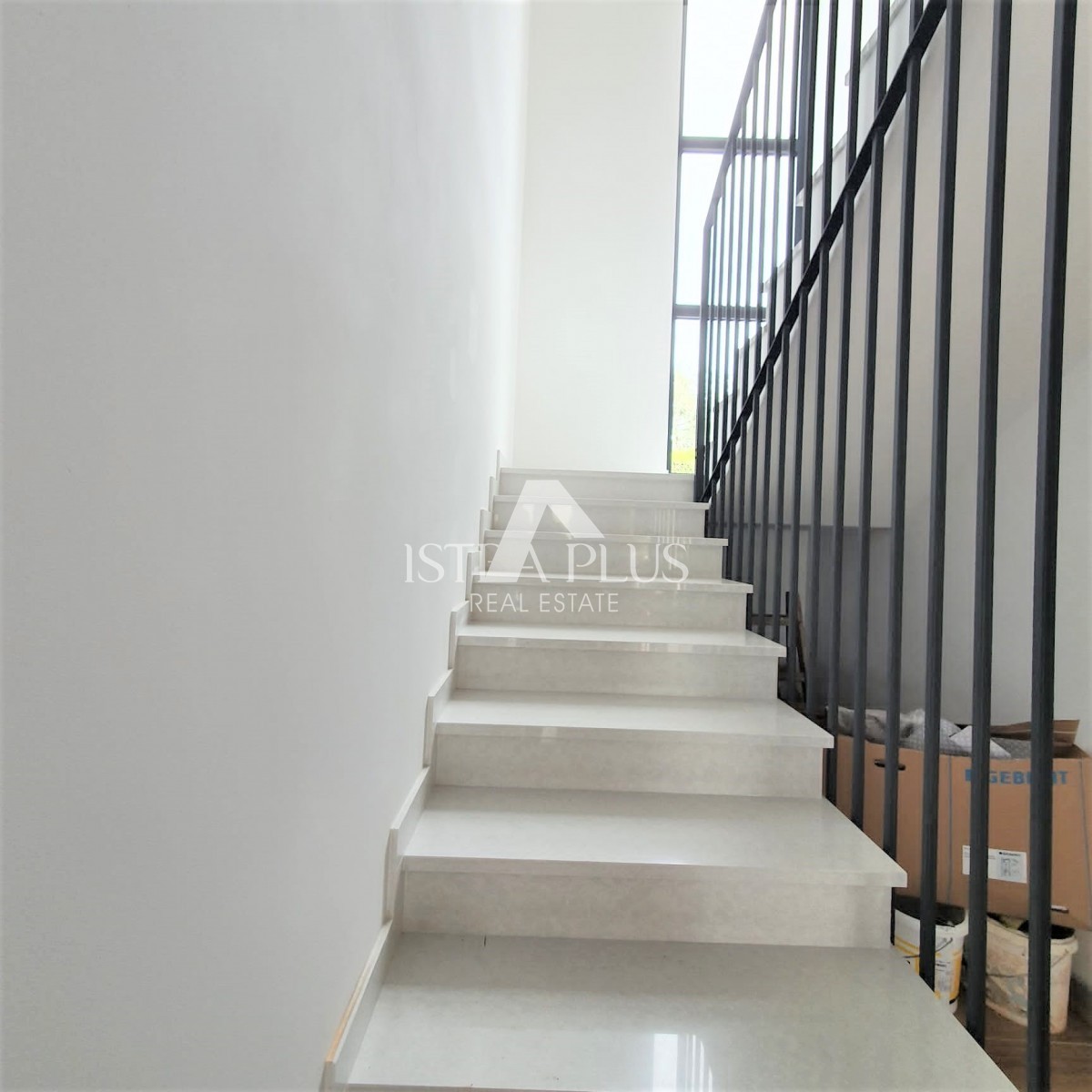 Stepenište vodi na kat gdje se nalazi predsoblje, wellnes prostorija sa tušem te je tu predviđena sauna , tri spavaće sobe sa vlastitim kupaonama i sve tri imaju izlaz na terasu gdje su postavljene instalacije sa jacuzzi .