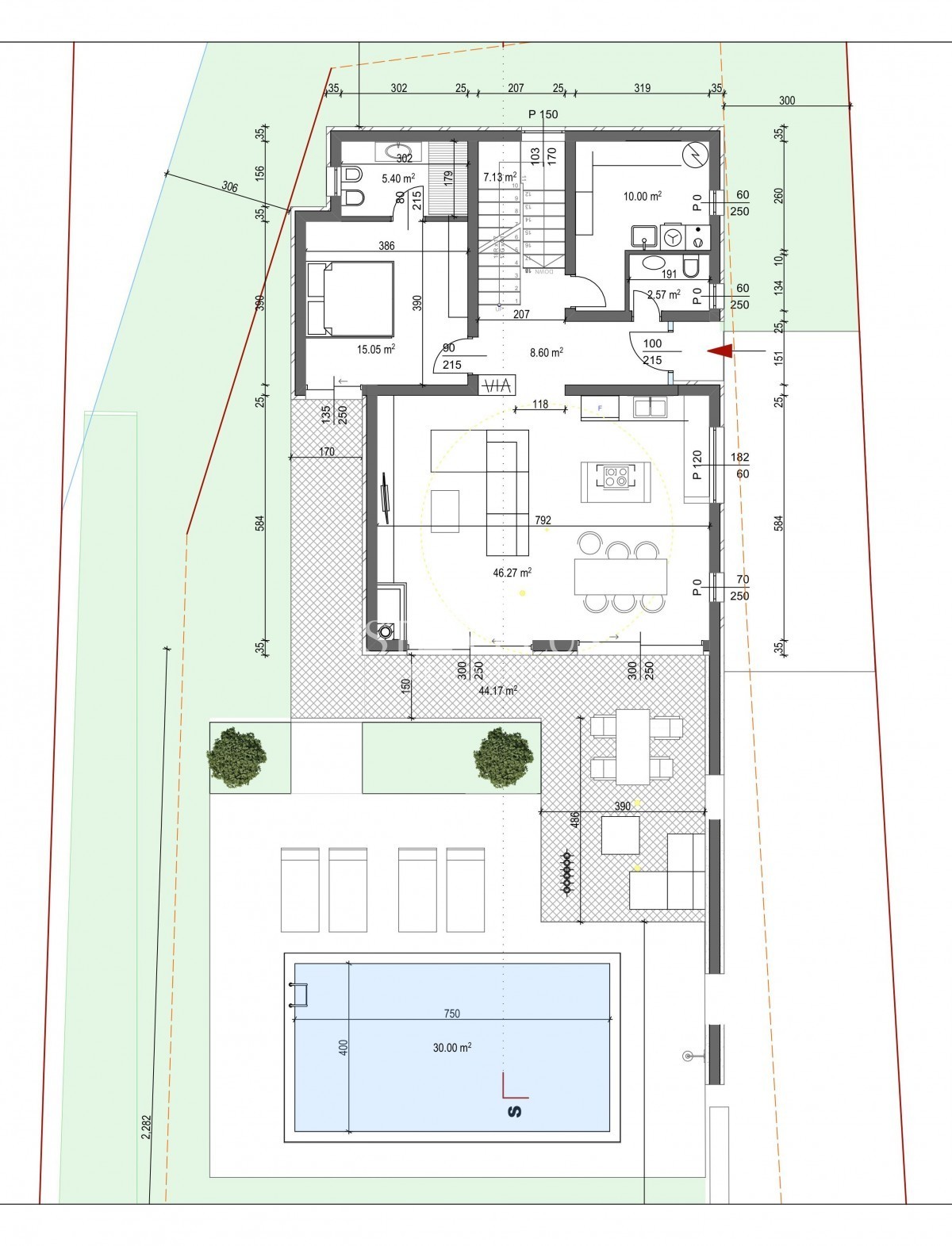 Otvoreni dnevni boravak gdje je predviđen kamin sa kuhinjom i blagovaonicom . Velike staklene stijene , puno prirodne svjetlosti okrenuta prema zapadu . Izlazi na natkrivenu terasu lagano zatvorenu , a dio je ne natkriven , u nastavku grijani bazen 30m2, sunčalište i vanjski tuš .