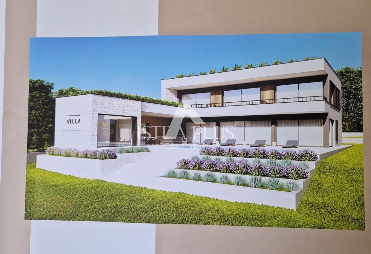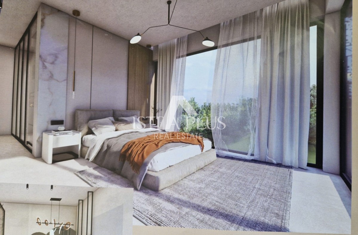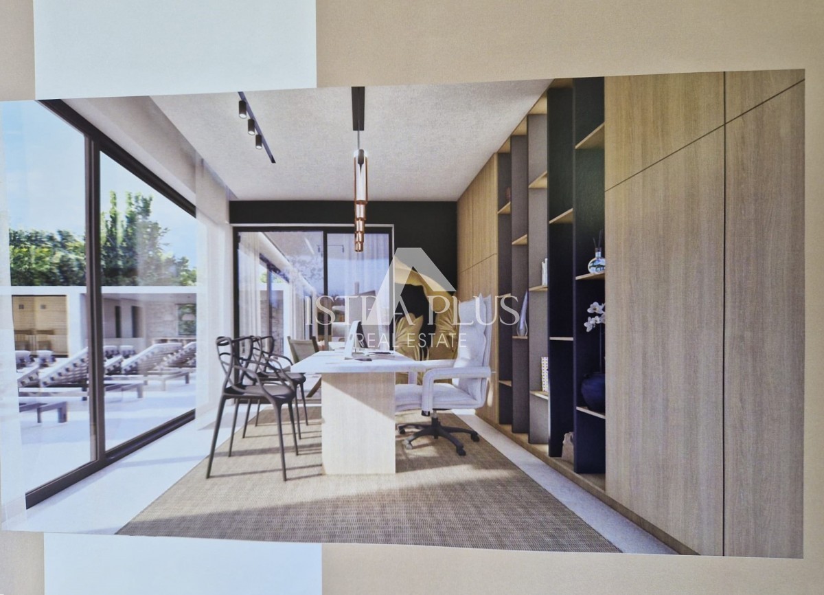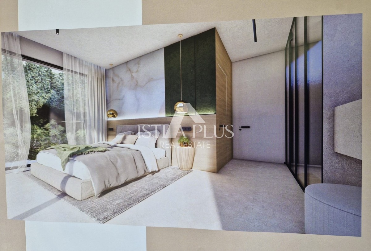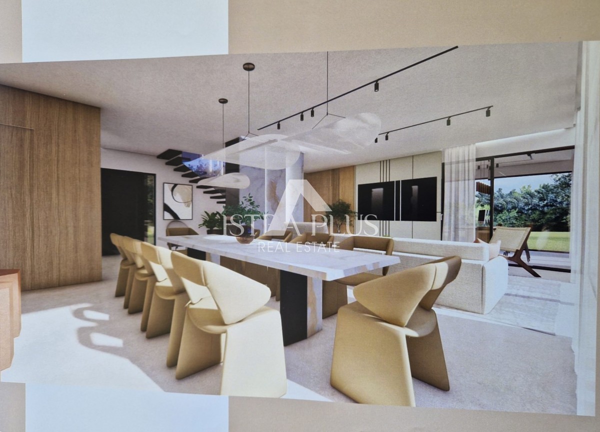 U prizemlju se nalazi natkriveni ulaz, kroz kojeg se ulazi u vilu gdje se nalazi dnevni boravak, kuhinja sa blagovaona sve po open space konceptu, spremište s vešerajem, gostinjski WC, spavaća soba s vlastitom kupaonicom i radna soba. U u dnevnom boravku i blagovani se proteže staklena klizna stijena iz koje se izlazi u dvorište gdje se nalazi natkrivena terasa, sunčalište, grijani bazen od 50m2, prostrana ljetna kuhinja, Sauna i kupanica.