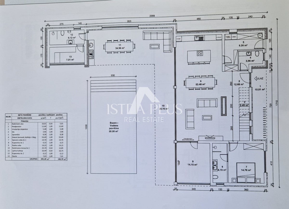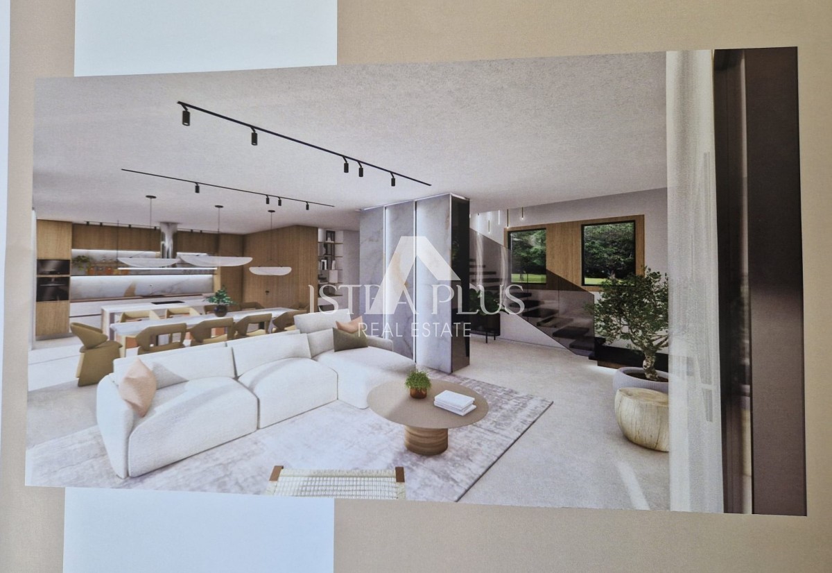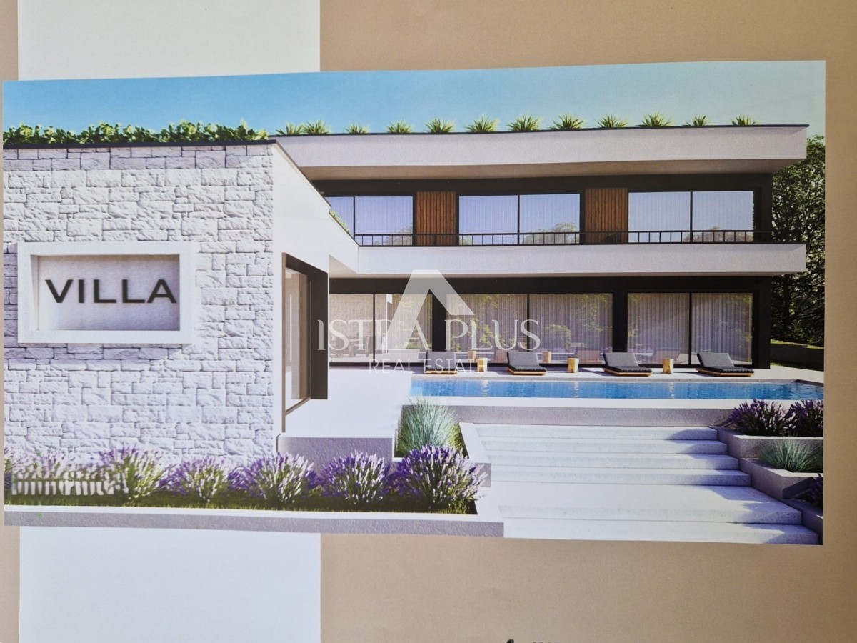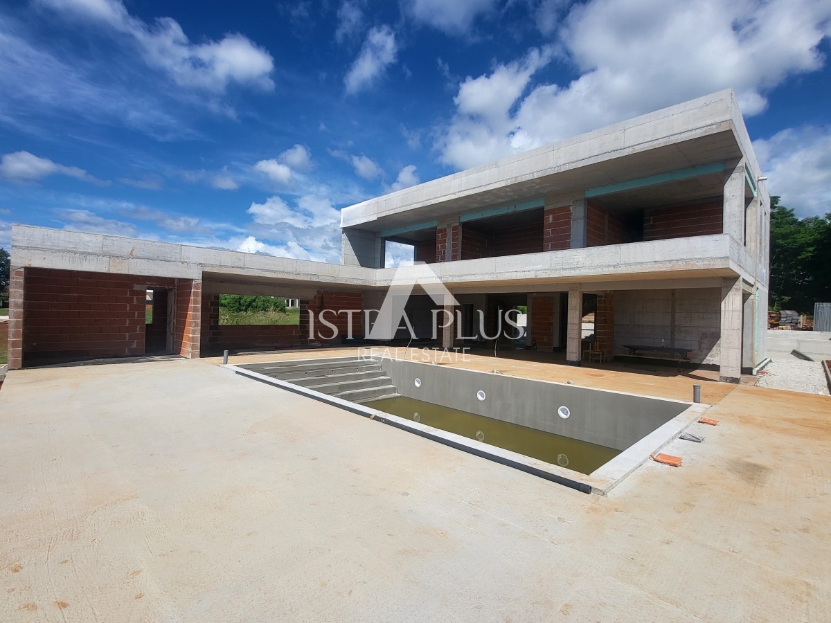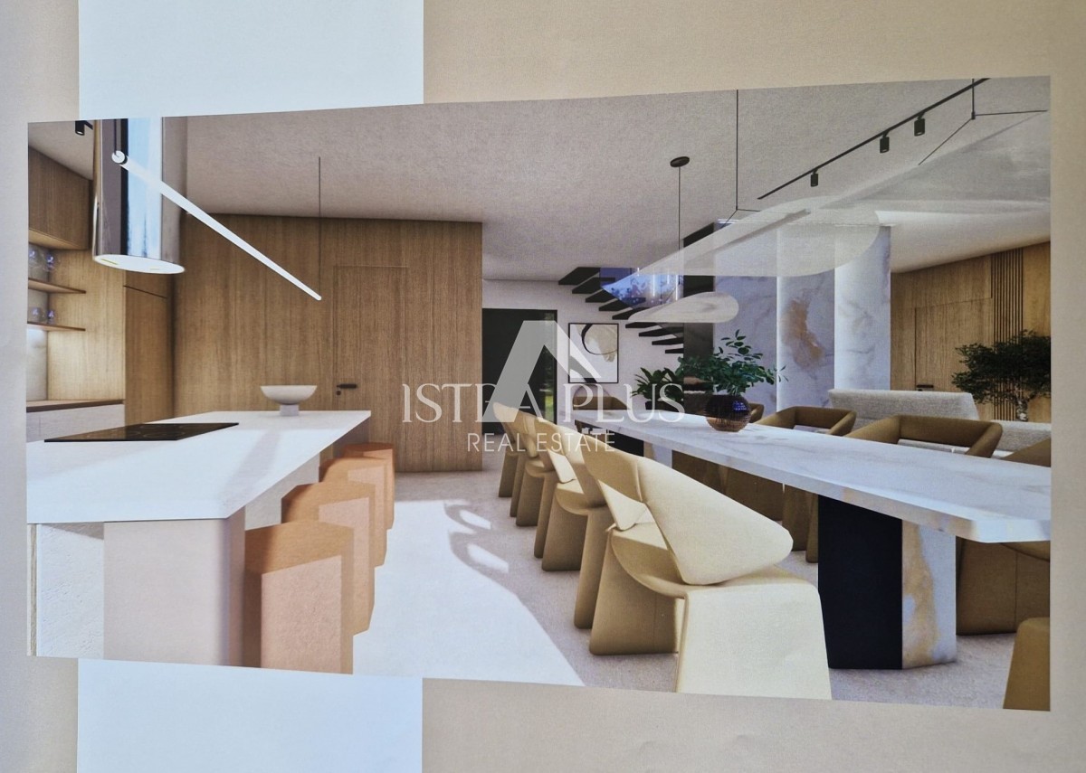 U prizemlju se nalazi natkriveni ulaz, kroz kojeg se ulazi u vilu gdje se nalazi dnevni boravak, kuhinja sa blagovaona sve po open space konceptu, spremište s vešerajem, gostinjski WC, spavaća soba s vlastitom kupaonicom i radna soba. U u dnevnom boravku i blagovani se proteže staklena klizna stijena iz koje se izlazi u dvorište gdje se nalazi natkrivena terasa, sunčalište, grijani bazen od 50m2, prostrana ljetna kuhinja, Sauna i kupanica.