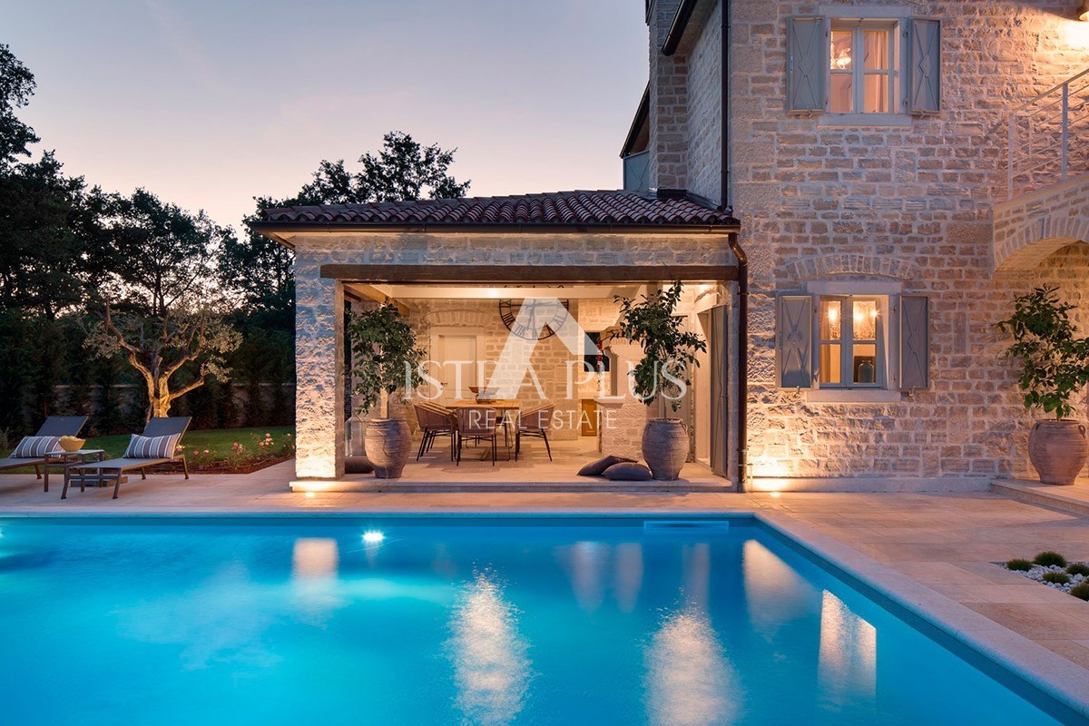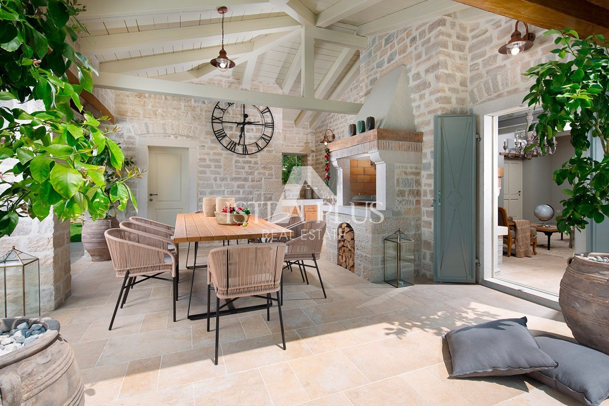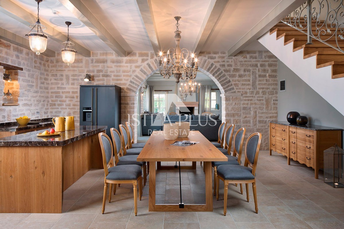 Luksuzna vila sa bazenom površine 359 m2 na dvije potpuno klimatizirane etaže kapaciteta 8 osoba. U prizemlju kuće nalazi se prostrani dnevni boravak sa kaminom i SAT-TV te izlazom na prostranu natkrivenu terasu sa stolom za objedovanje, kaminom za roštiljanje i lounge zonom, velika, potpuno opremljena kuhinja sa blagovaonicom, jedna dvokrevetna soba sa dvostrukim krevetom, vlastitim tuš-WC-om i izlazom na terasu, zaseban WC u dnevnom dijelu i tuš/WC na terasi.