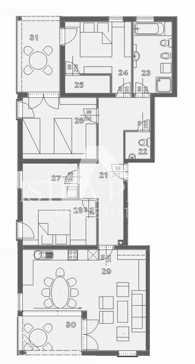 Stan se prostire na površini od 119 m² i sastoji se od prostranog ulaznog hodnika, svijetlog dnevnog boravka s blagovaonicom i terasom, moderne, potpuno opremljene kuhinje s vrhunskim aparatima, tri spavaće sobe, od kojih dvije imaju izlaz na terasu i četvrta manja radna soba. Također, stan ima elegantnu kupaonicu s kadom i tuš kabinom te odvojeni WC za goste.