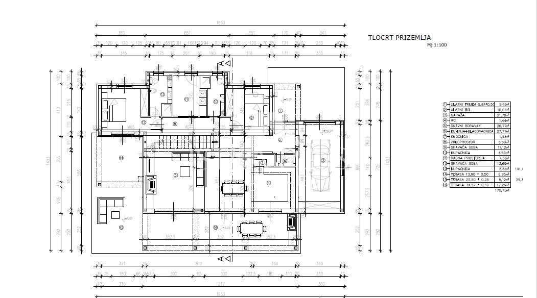 U prizemlju kuće nalazi se prostrani dnevni boravak sa kaminom, kuhinja sa blagovaonom,spremište,izlaz na natkrivenu terasu, ljetnu kuhinju sa kaminom i dvorište sa bazenom (12x4). Gostinjski wc, dvije spavaće sobe sa kupaonama. Ulaz u garažu sa vanjske strane i također iz kuće.Na prvome katu se nalaze još dvije spavaće sobe sa kupaonama i izlazom na terasu sa pogledom na more.