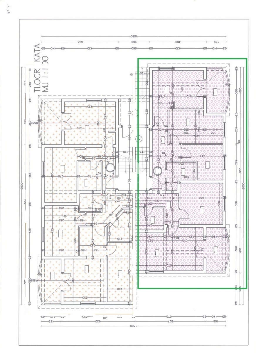 Smješten je na 1. kat ukupne kvadrature od 104,86m2 ; u naravi je podijeljen na 2 stana .