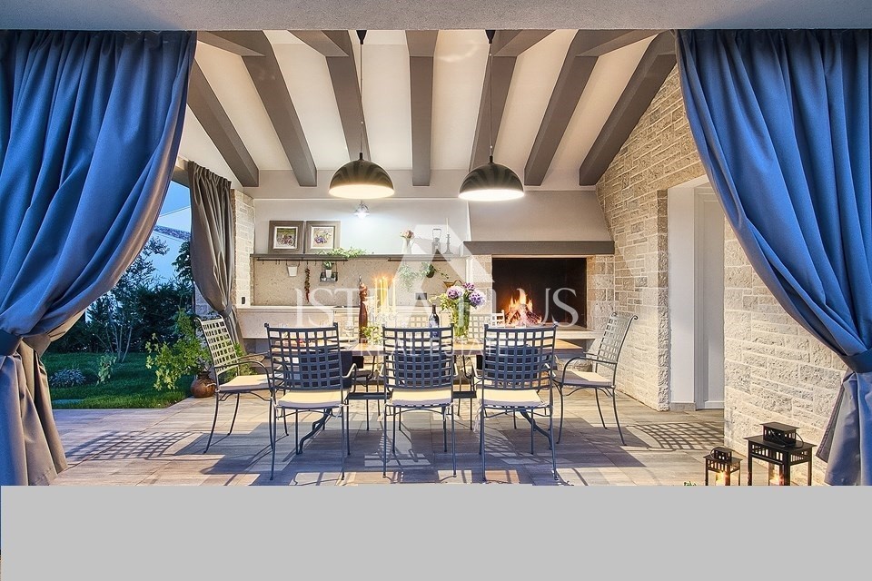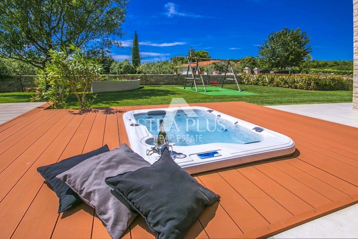 Vrt s automatskim navodnjavanjem , bazen od 48m2 , jacuzzi, ljetna kuhinja sa kaminom ,