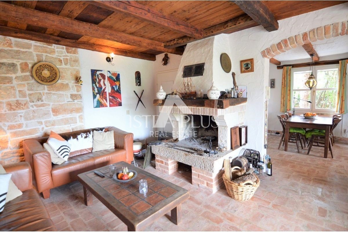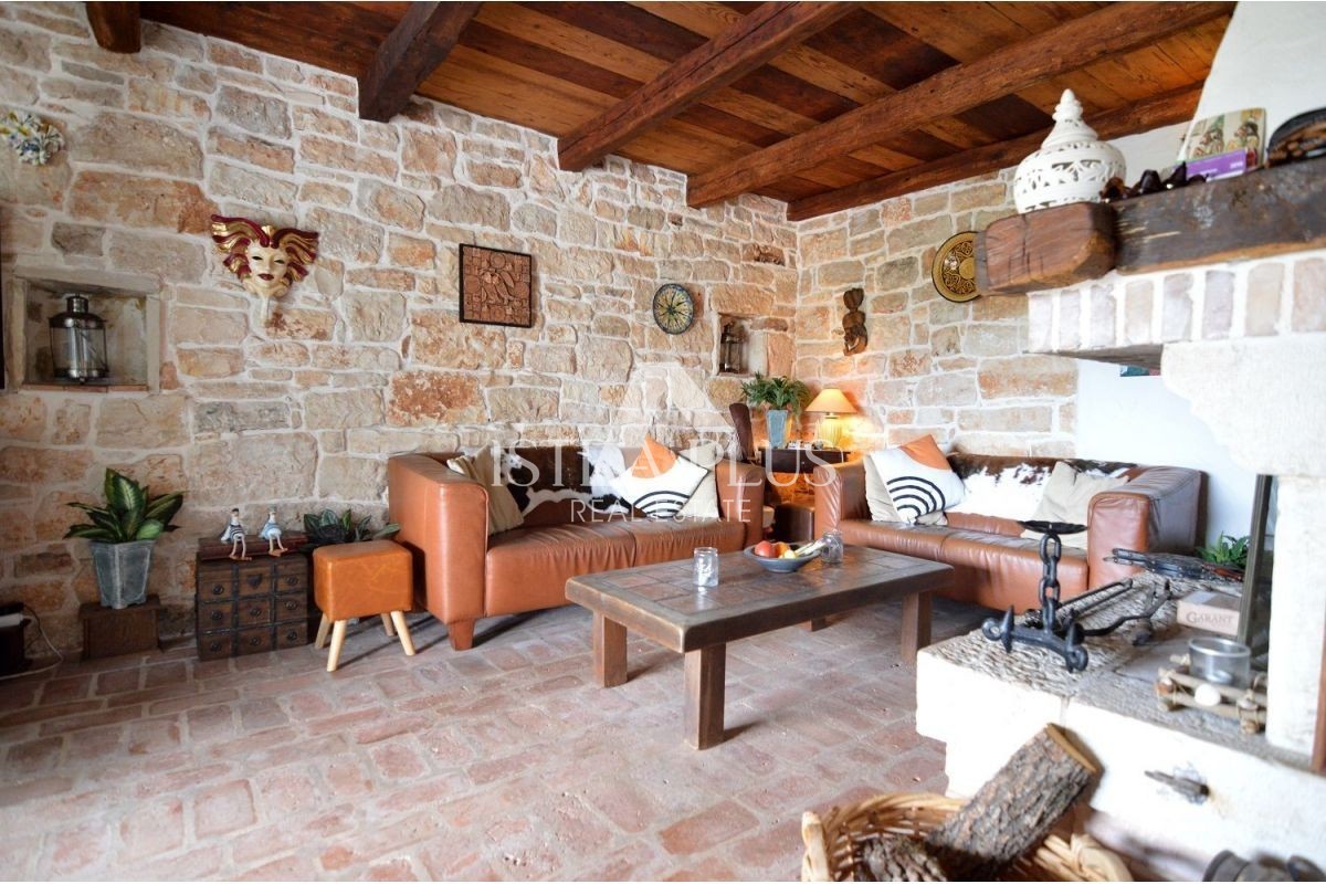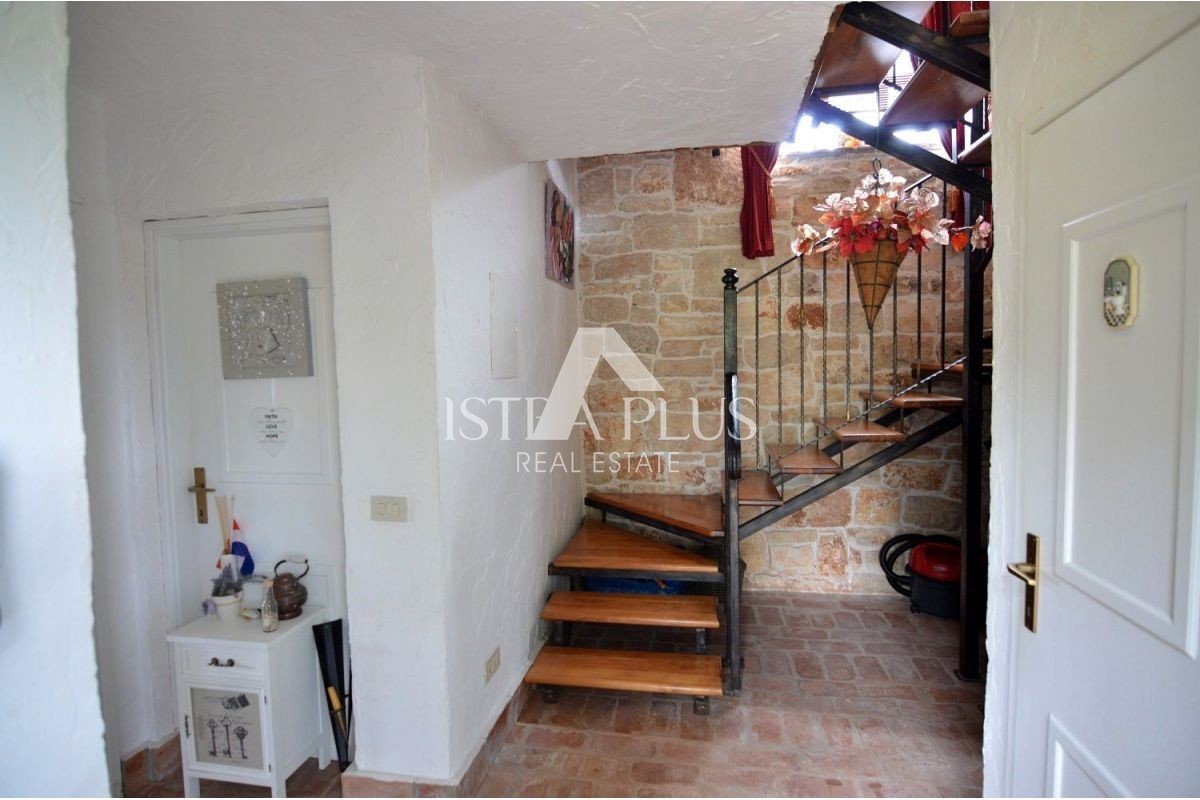 Una bella casa bifamiliare in pietra in vendita a Torre- Vabriga, composta da un piano terra e un primo piano. Al piano terra troviamo un ingresso, un bagno con doccia, una dispensa, una cucina con sala da pranzo e un soggiorno con camino e un'uscita su un ampio terrazzo coperto su cui ci sono panche e un tavolo per la famiglia incontri o piacevoli incontri con gli amici.