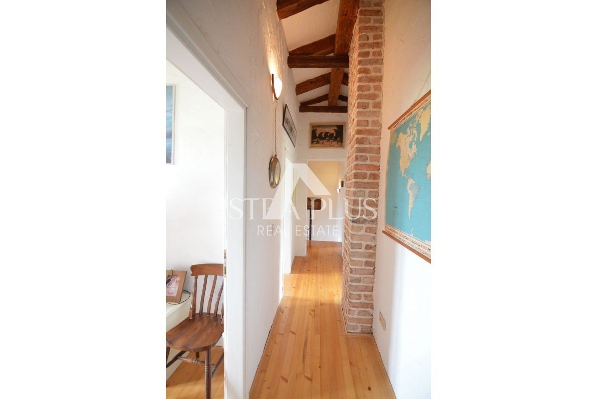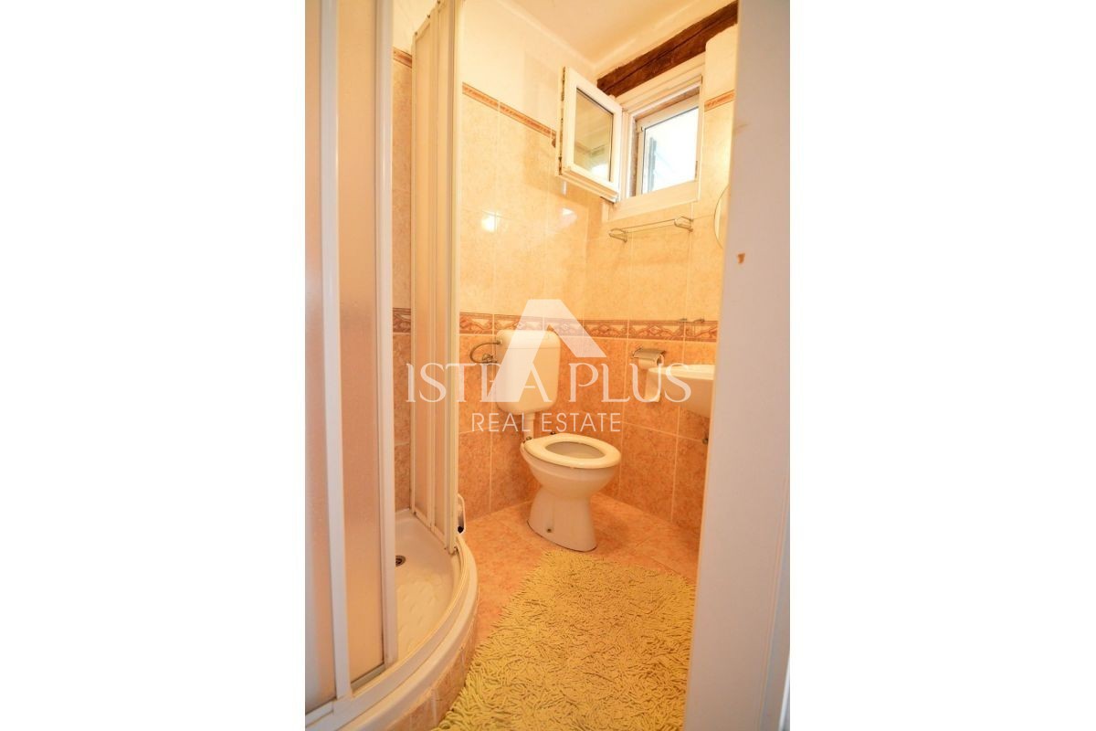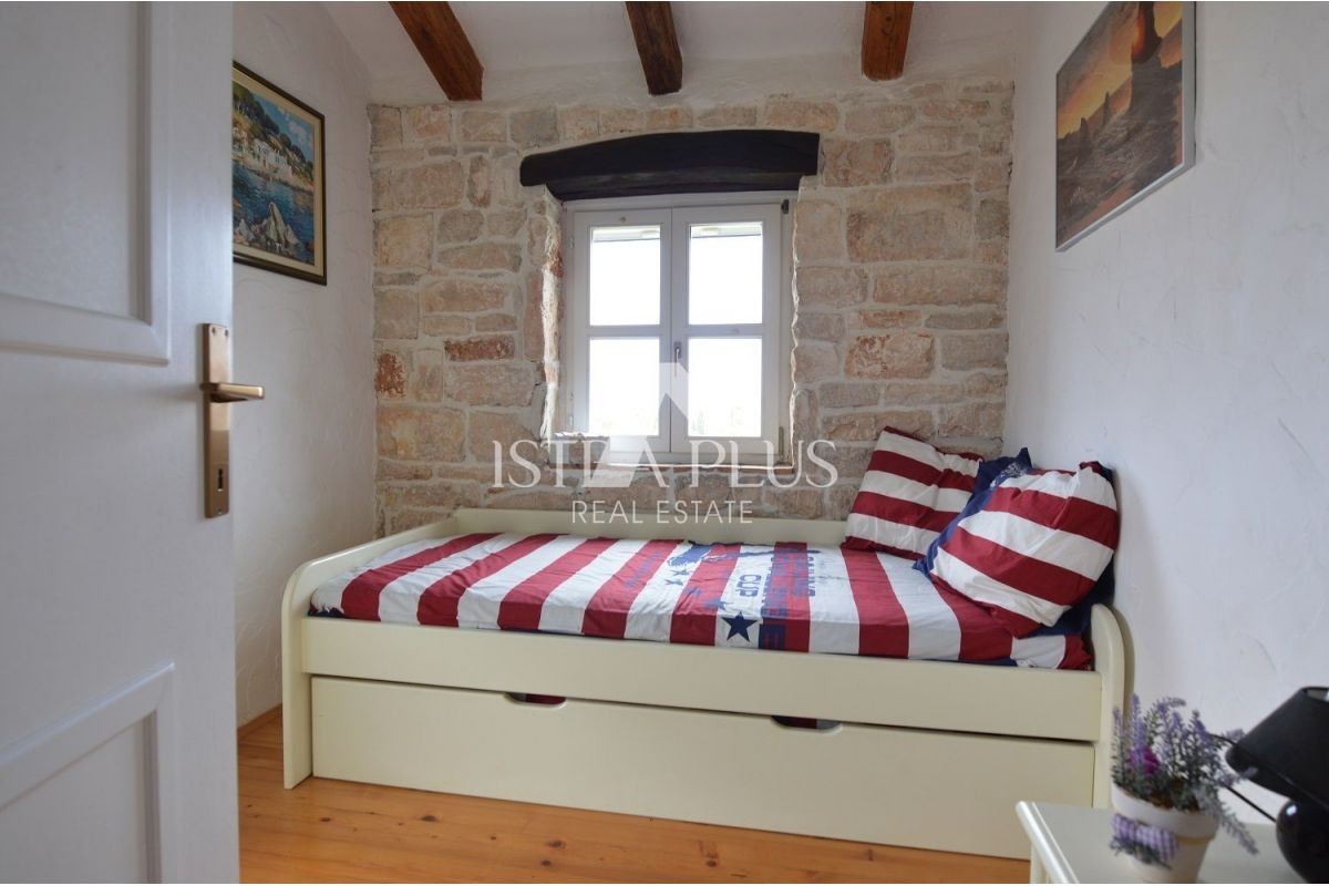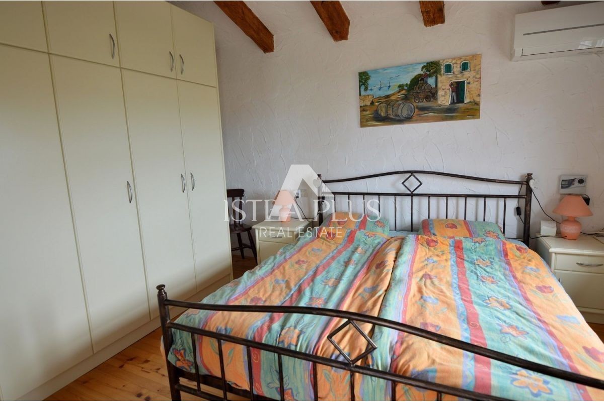 Una bella casa bifamiliare in pietra in vendita a Torre- Vabriga, composta da un piano terra e un primo piano. Al piano terra troviamo un ingresso, un bagno con doccia, una dispensa, una cucina con sala da pranzo e un soggiorno con camino e un'uscita su un ampio terrazzo coperto su cui ci sono panche e un tavolo per la famiglia incontri o piacevoli incontri con gli amici.