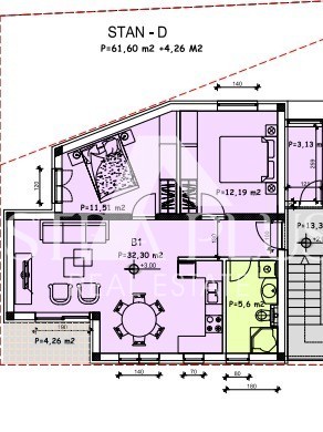 Superficie di 66 m² ed è composto da ingresso, cucina con sala da pranzo e soggiorno con accesso alla terrazza, bagno e due camere da letto.