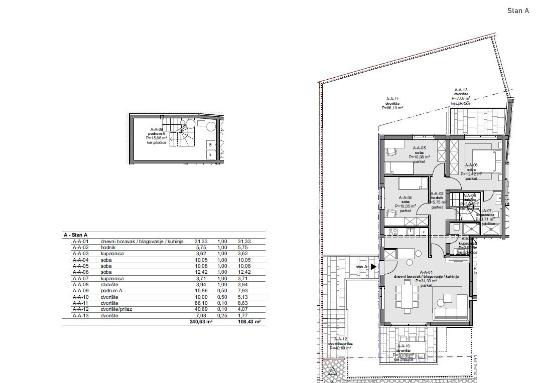 APPARTAMENTO A al piano terra dell'edificio - la superficie dell'appartamento è di 88,83 m2, che comprende un seminterrato di 7,93 m2 e ca. Giardino di 144 mq