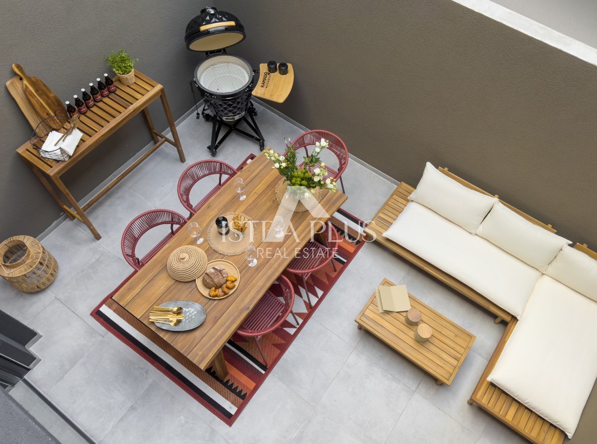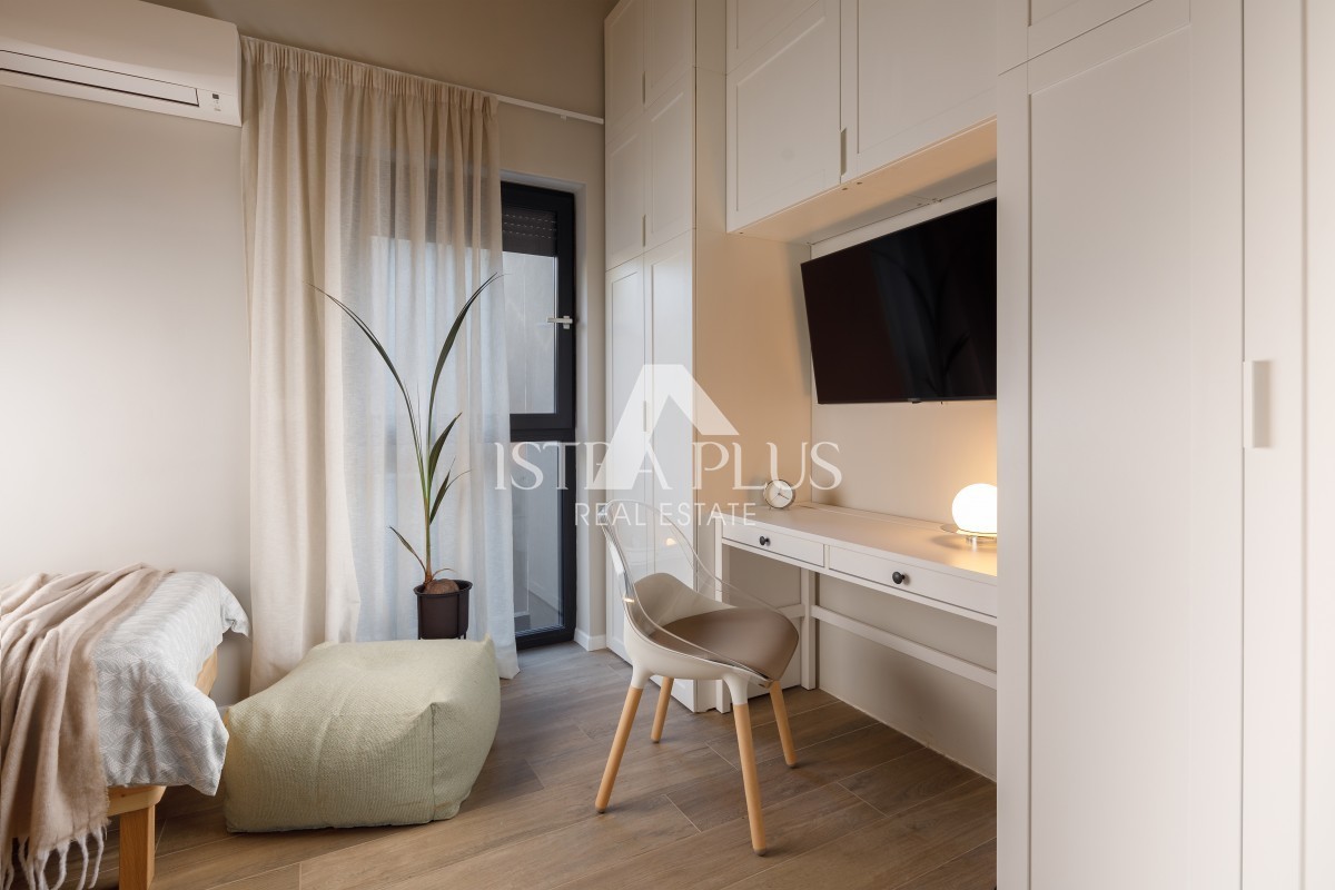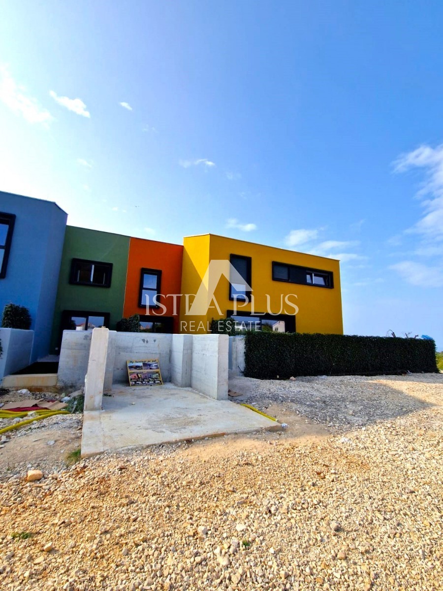 V pritličju shramba, dnevna soba, kuhinja in jedilnica izhod na dvorišče in stranišče. V prvem nadstropju hiše se bosta nahajali dve spalnici z eno kopalnico, hodnik.Ternaste hiše so primer moderne stanovanjske gradnje.Deset vrstnih hiš po pet na vsaki strani. Omogočajo tudi visoko raven zasebnosti s toplim občutkom soseščine. Vsaka hiša ima vrt in parkirno mesto, šest hiš pa ima pogled na morje. Najbližja plaža je oddaljena 950 m, center Poreča pa 2 km Vsaka hiša je sestavljena iz dveh etaž in ima v povprečju 65 kvadratnih metrov, z večjo ali manj kvadraturo, odvisno od lokacije hiše. Velikost vrta se giblje od 42 m 2 do 104 m 2, prostor pa je ograjen, notranjost je organizirana tako, da je edinstven prostor kuhinje, jedilnice in dnevne sobe v pritličju, z dostopom do terasa, v zgornjem nadstropju pa sobe. Večja kopalnica je v zgornjem nadstropju, WC pa v pritličju. Vsaki hiši pripada eno parkirno mesto z možnostjo dodajanja več parkirnih mest, posebna pozornost je namenjena organizaciji in ureditvi notranjosti, da bo bivanje v hiši čim prijetnejše. Poudarek je na naravni svetlobi, ki je zaradi velikih steklenih površin obilna. Sodoben stil dekoracije z dnevno svetlobo in uporaba naravnih barv prispeva k ambientu, ki izžareva optimizem in udobje.Pritličje je tekoča soba s podaljškom vrta in je zasnovana kot osrednji prostor za dnevne aktivnosti. V zgornjem nadstropju so spalnice, navpično ločen galerijski prostor ene izmed sob pa bo priljubljeno ustvarjalno zatočišče - tako odraslih kot otrok. Preizkušena kombinacija udobja, varnosti in funkcionalnosti naredi te hiše bivalne prostore prihodnosti.Lokacija nepremičnine dosega idealno ravnovesje med mirnim okoljem in bližino vseh želenih objektov kot so center mesta in plaže.izjemna kakovost življenja.